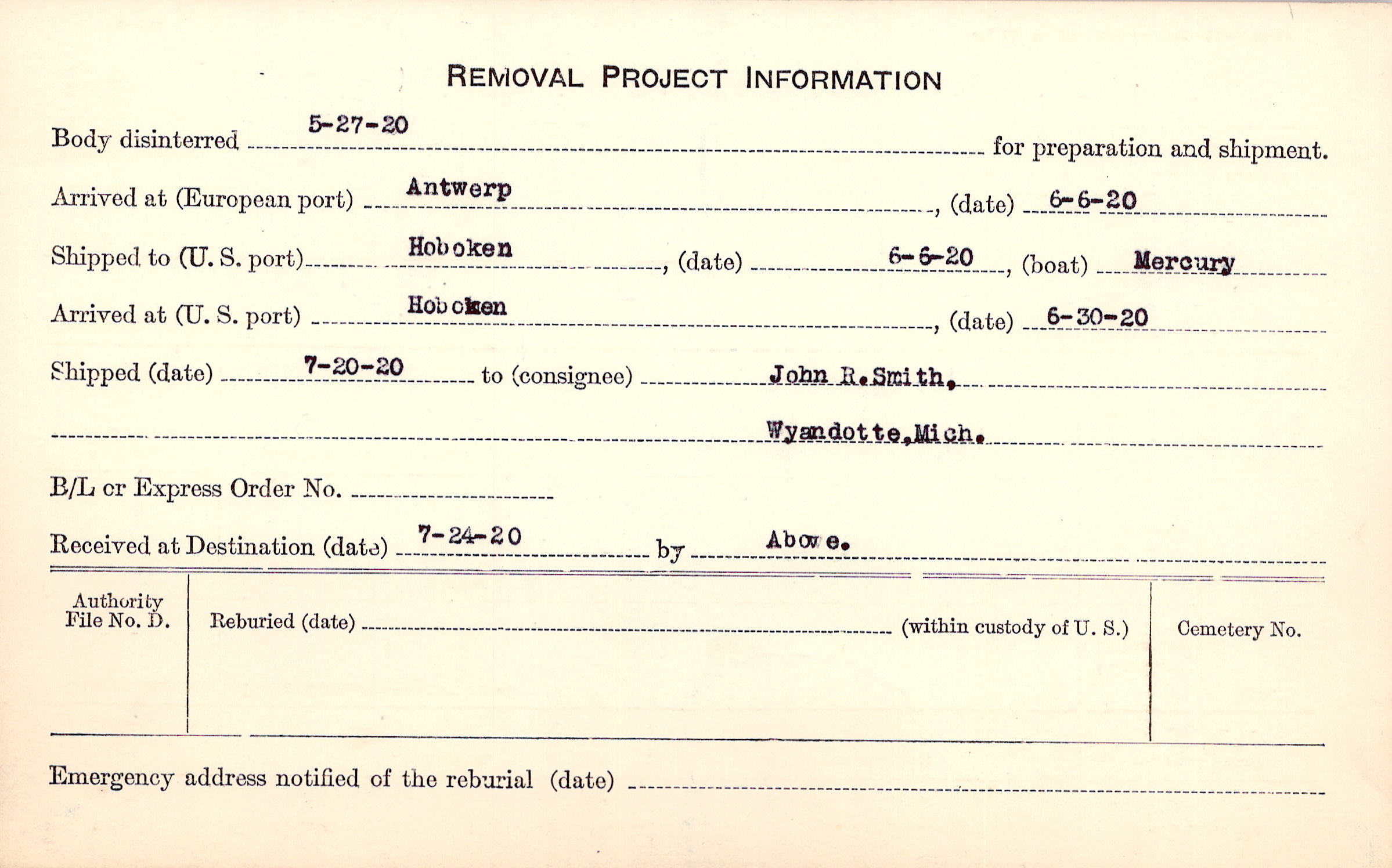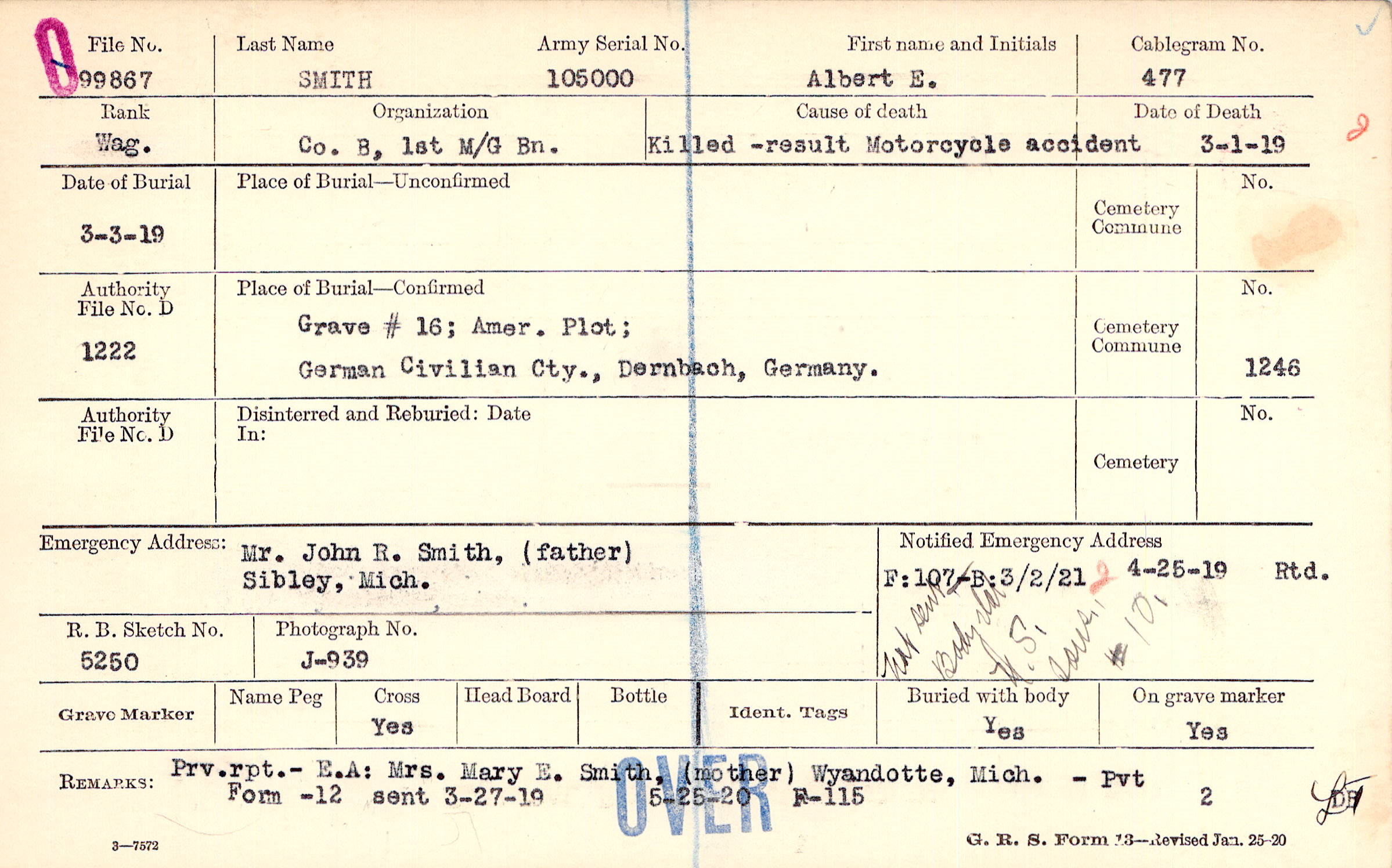 Form - 12 sent 3-27-19, Form -12 sent 3-27-19, 5-25-20 F-115 Prv. rpt. - E.A.; Mrs. E. Smith, (Mother) Wyandotte, Mich. - Pvt