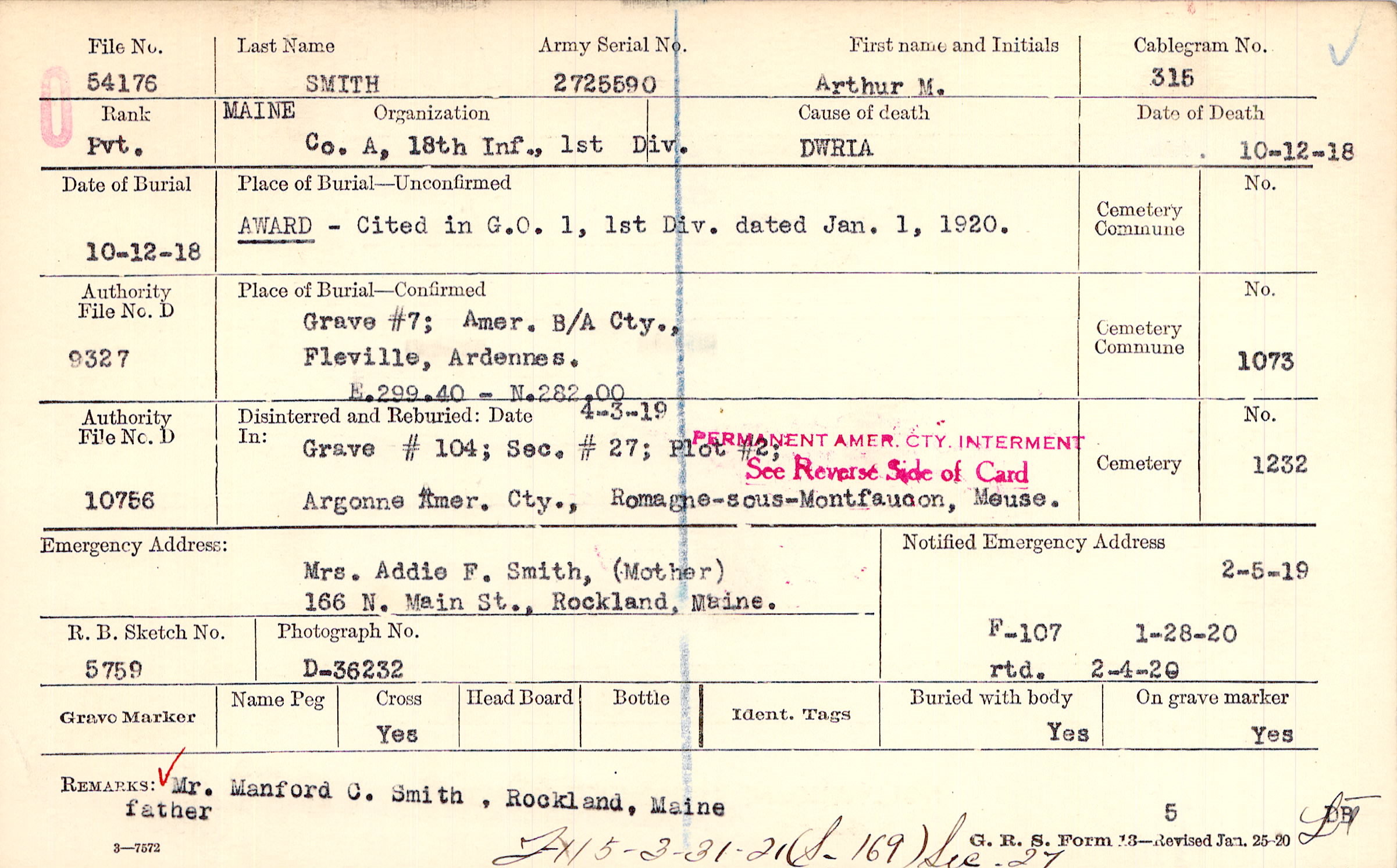Mrs. Addie F. Smith, (Mother), 166 N. Main St., Rockland, Maine.