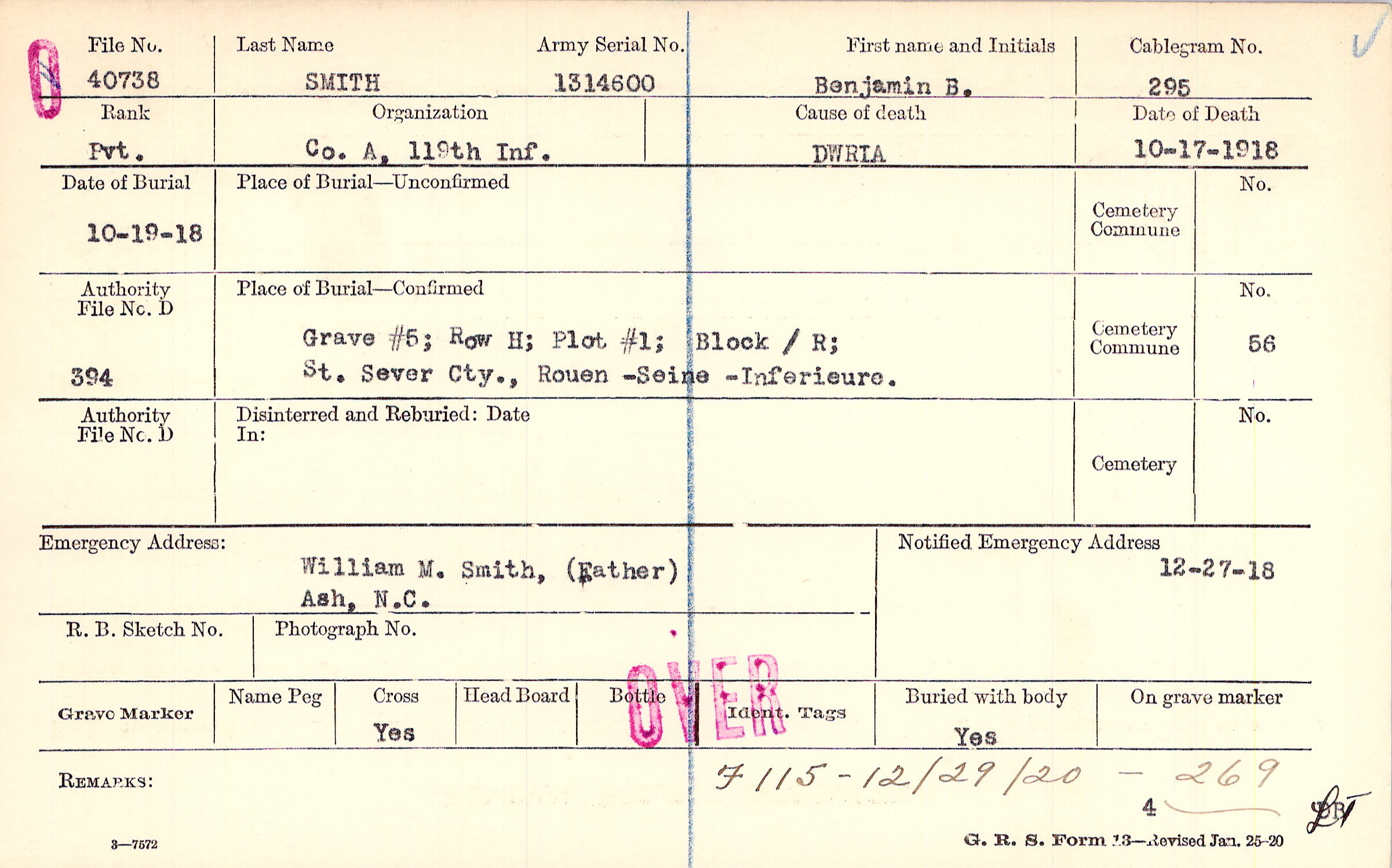 Grave #5, Row H, Plot #1, Block /R, St Sever Cty., ,Rouen -Seine -Inferieure.