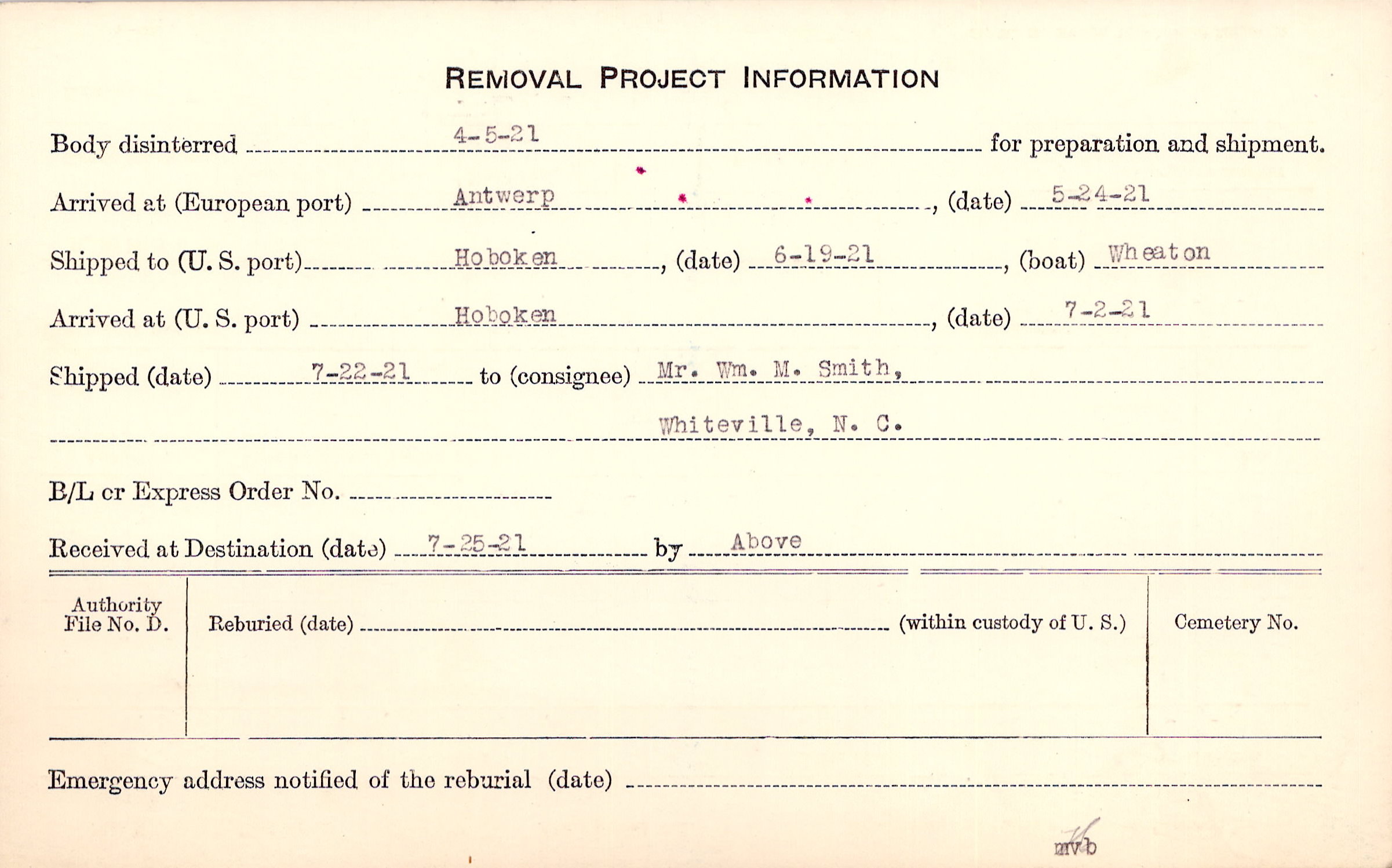 Body disinterred 4/5/1921 for preparation and shipment.