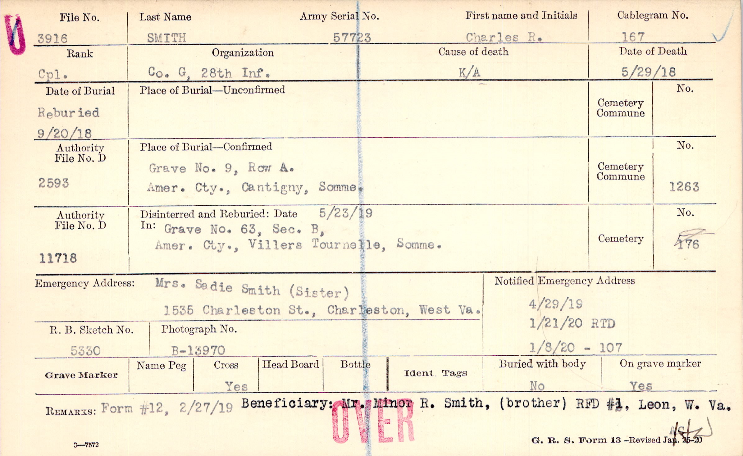 Beneficiary: Mr. Minor R. Smith, (brother) RFD #1, Leon, W. Va., Form #12, 2/27/19