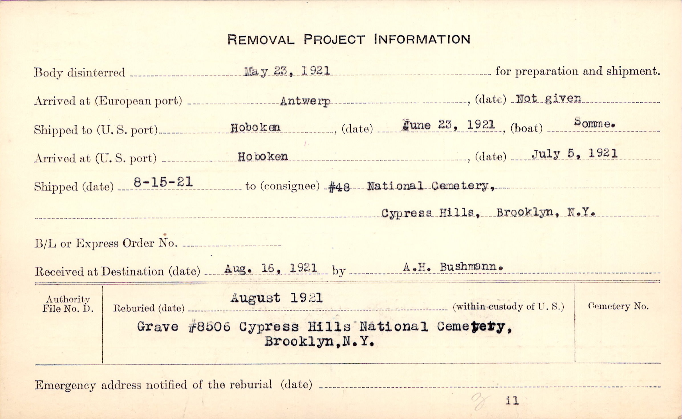 Body disinterred 5/23/1921 for preparation and shipment.