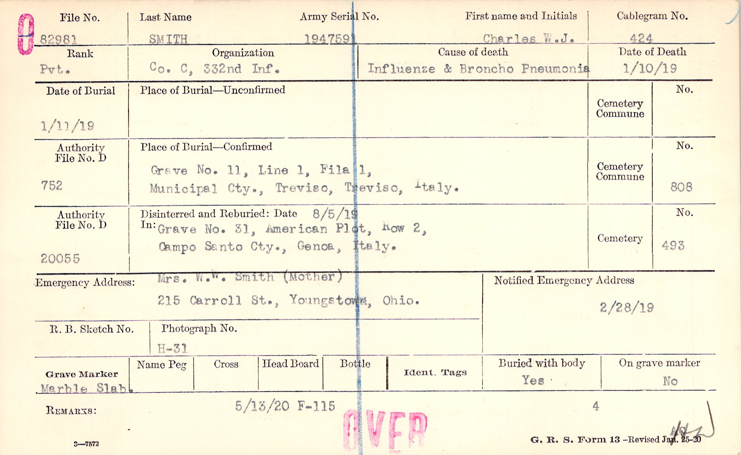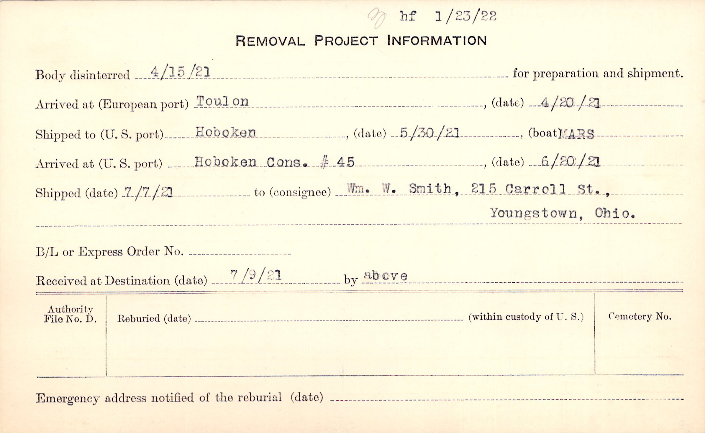 Mrs. W.W. Smith (Mother), 215 Carroll St., Youngstown, Ohio.