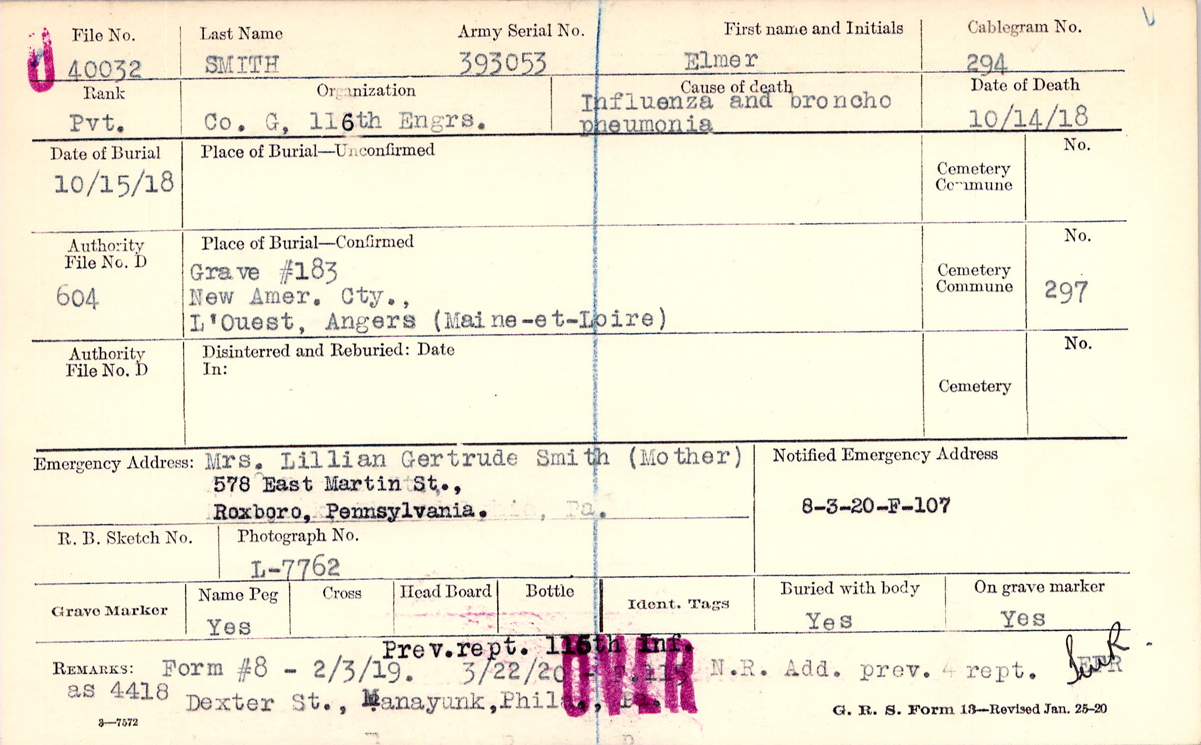 Prev.rpt. 116th Inf. N.R. Add. prev rept. as 4418 Dexter St., Manayunk, Phila., Pa., Form #8 - 2/3/19, 3/22/20 - F.115