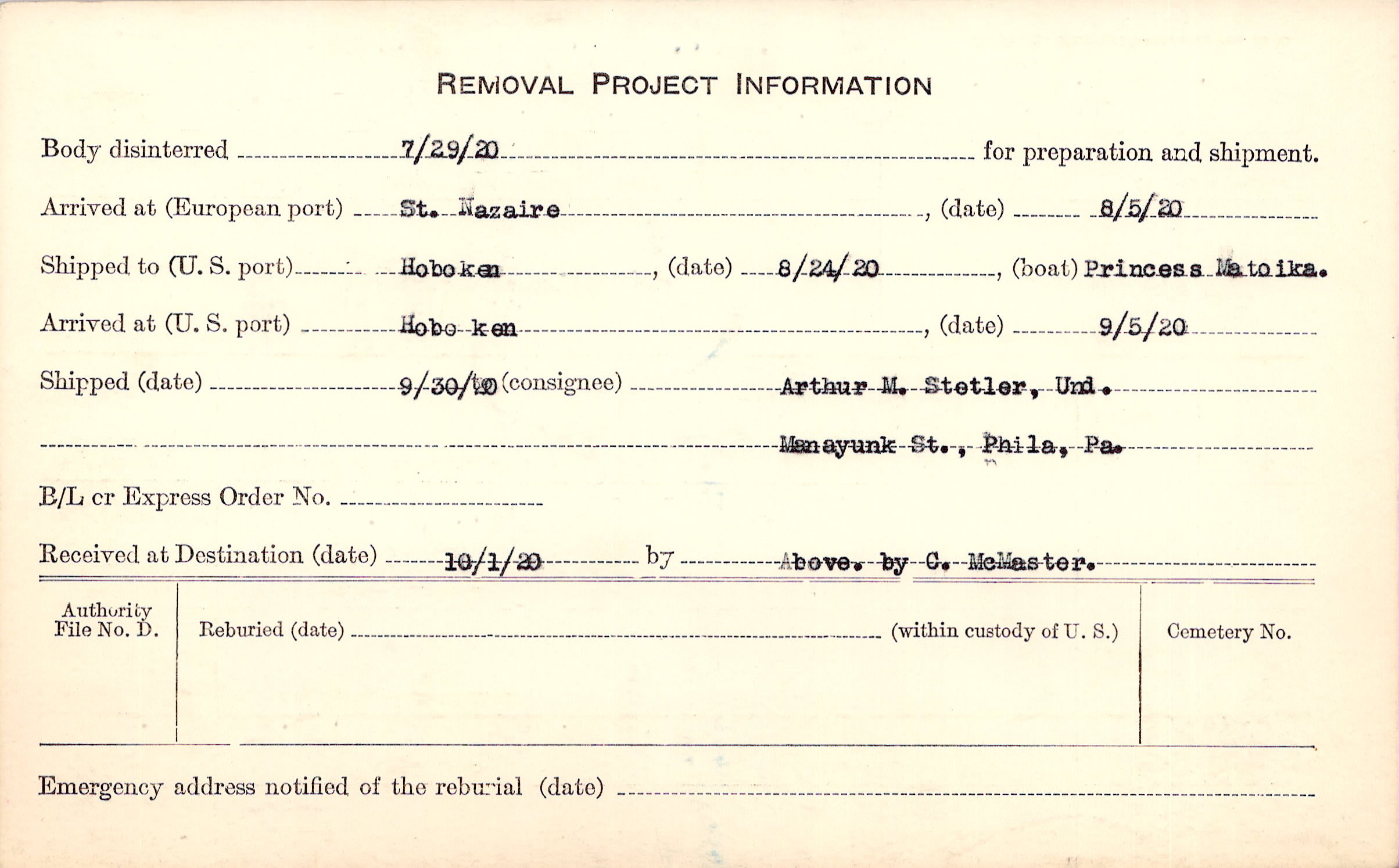 Body disinterred 7/29/1920 for preparation and shipment.