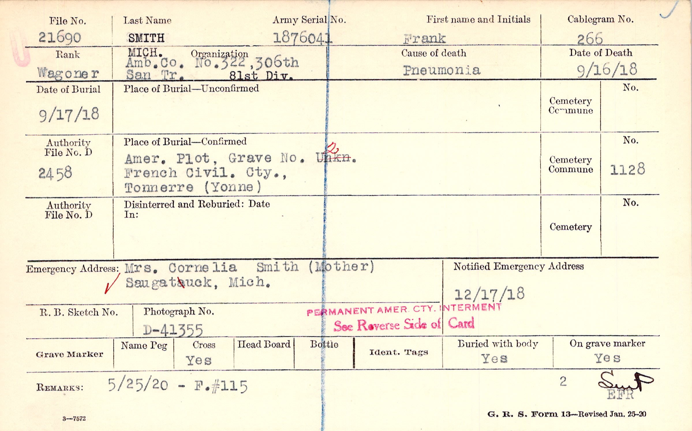 Amer. Plot, Grave 2, French Civil. Cty., Tonnerre, Yonne