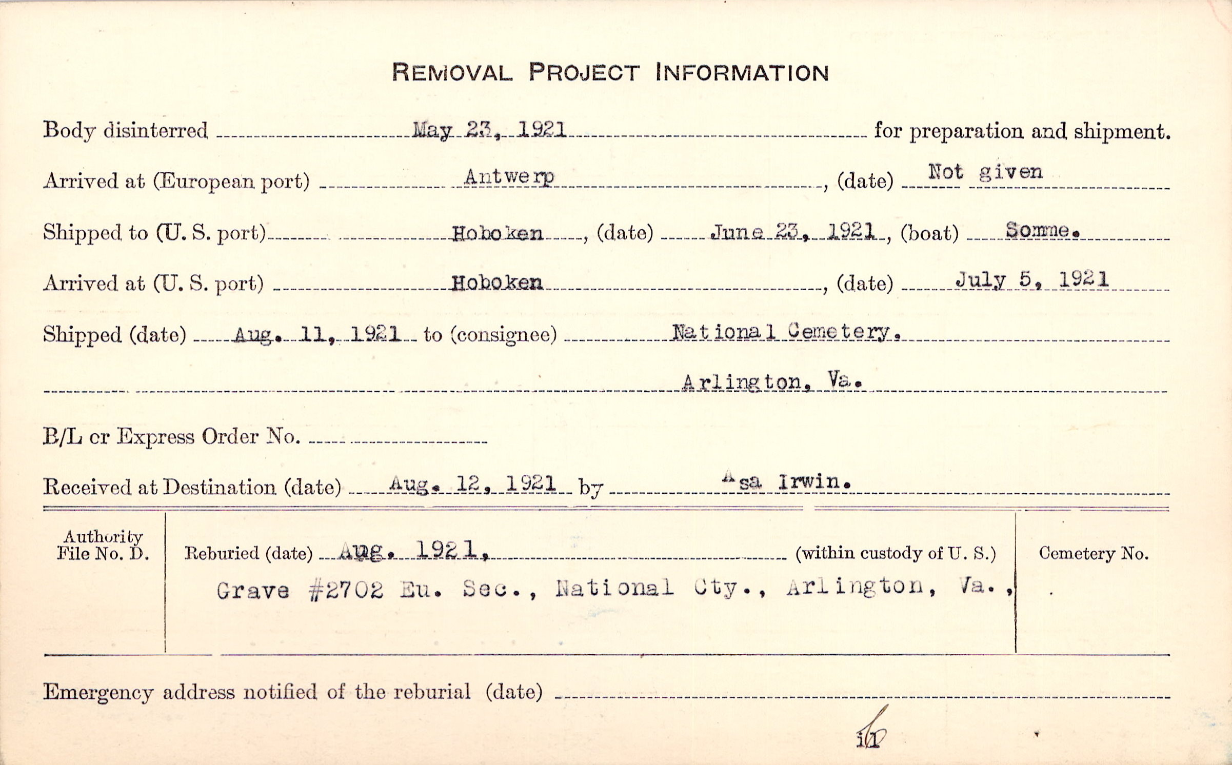 Body disinterred 5/23/1921 for preparation and shipment.