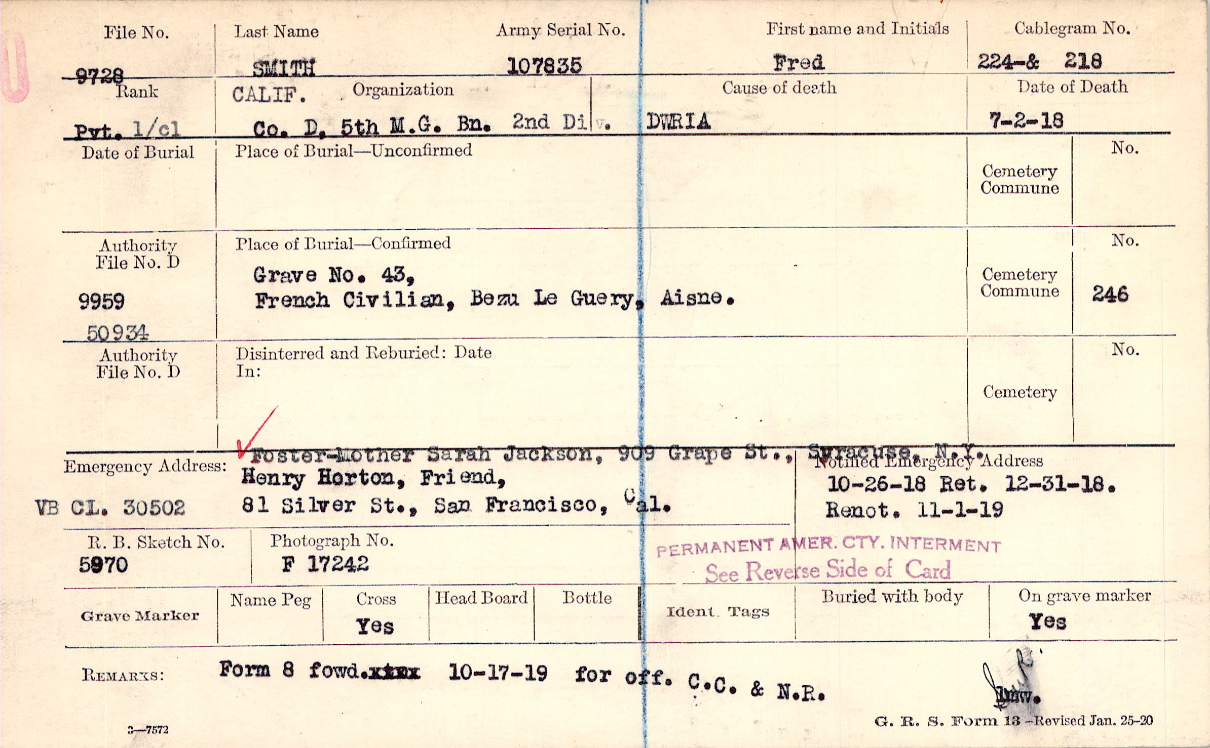 Henry Horton, Friend,, 81 Silver St., San Francisco, Cal., VB CL. 30502 Foster-Mother Sarah Jackson, 909 Grape St., Syracuse, N.Y.