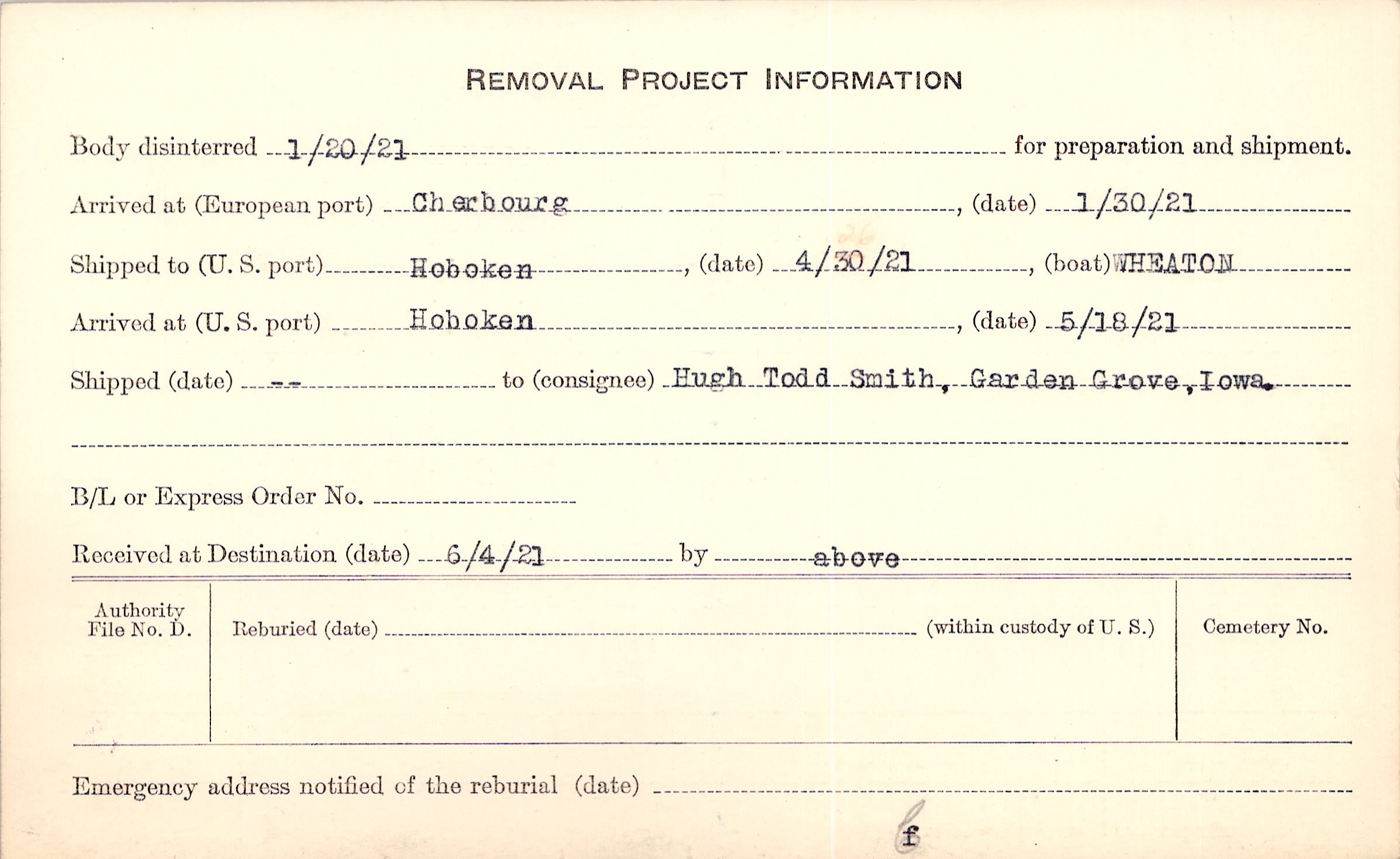 Body disinterred 1/20/1921 for preparation and shipment.