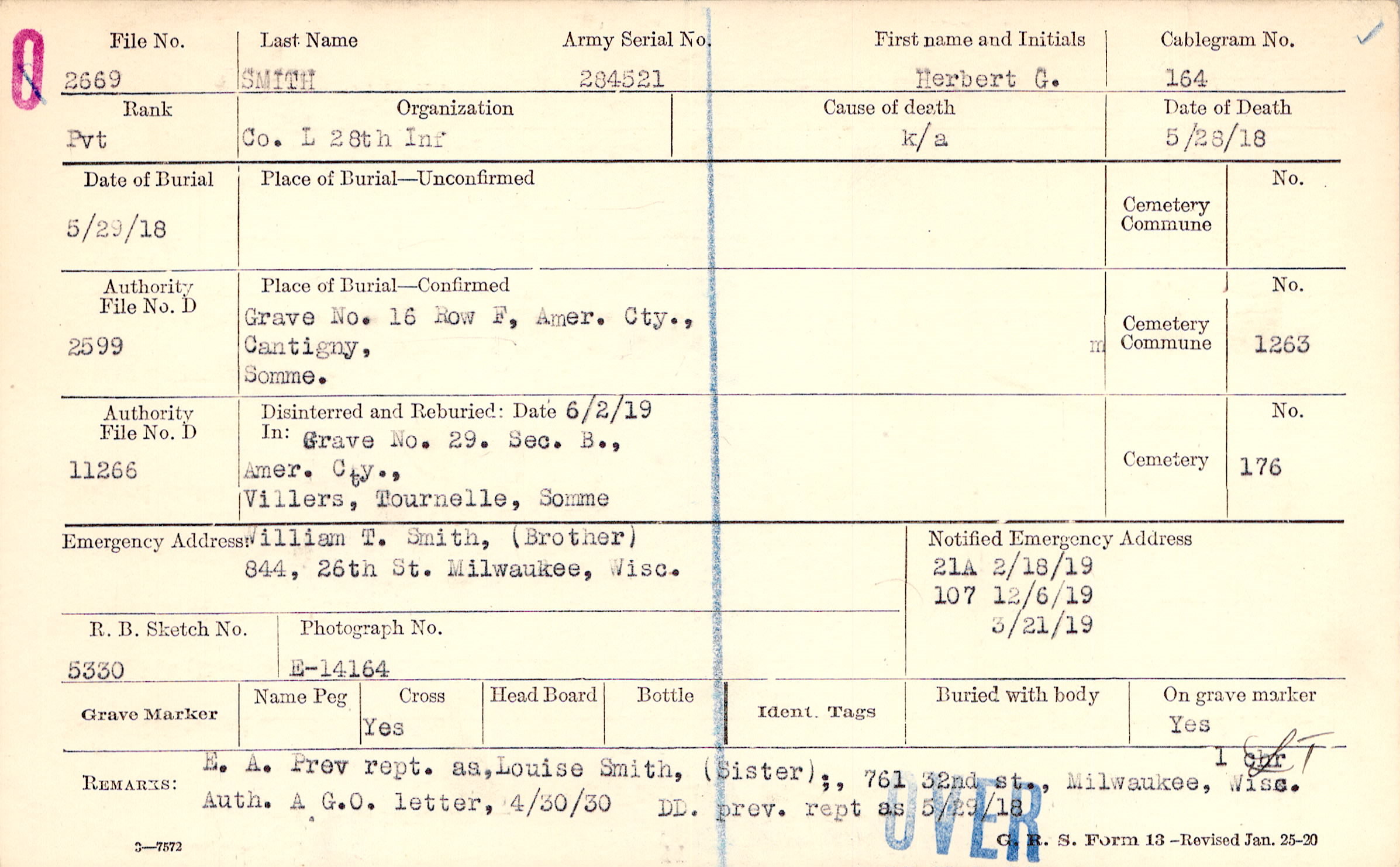 Grave 16, Row F, Amer. Cty., Cantigny, Somme.
