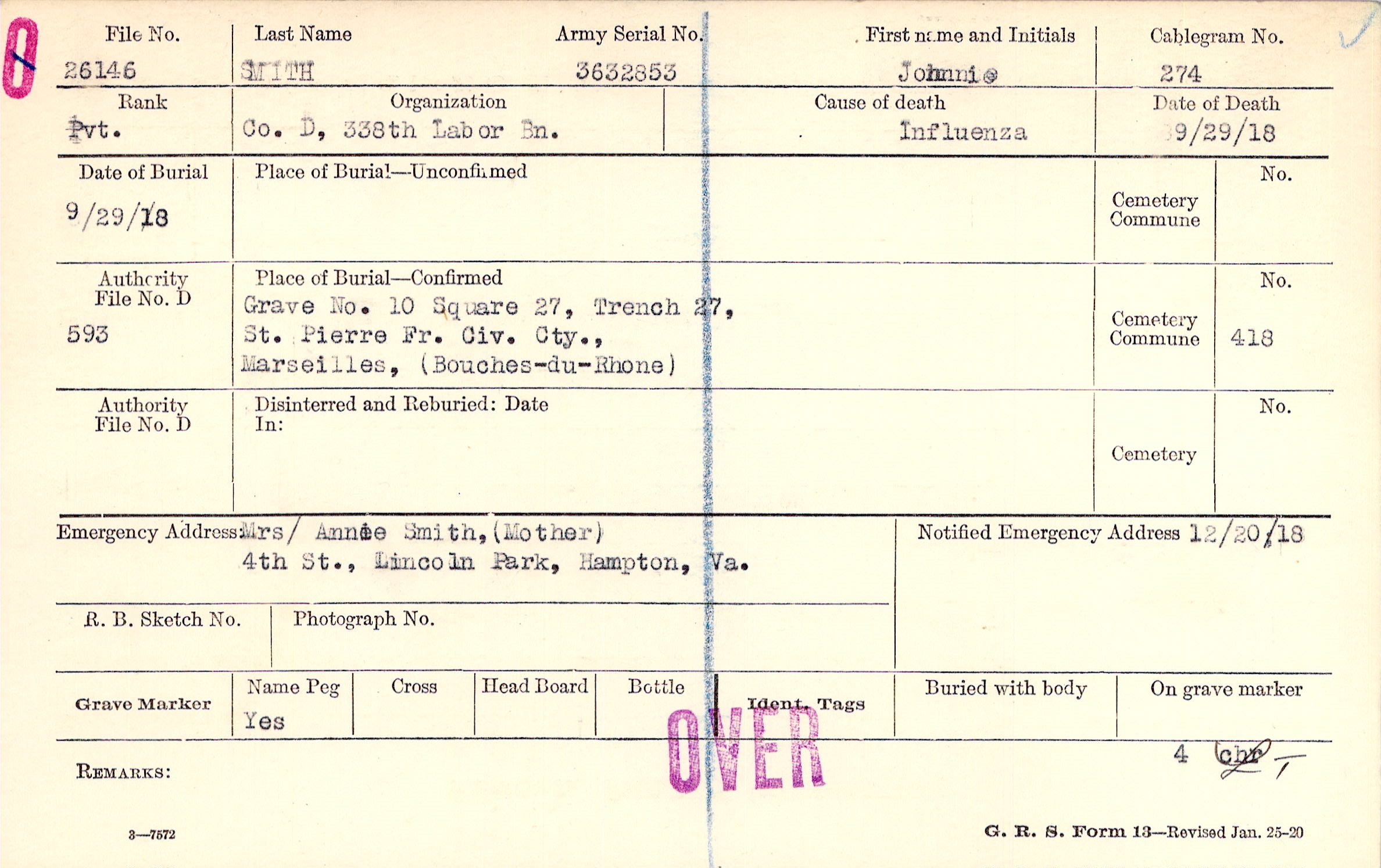 Grave 10 Square 27, Trench 27, St. Pierre Fr. Civ. Cty., Marseilles, (Bouches-du-Rhone)