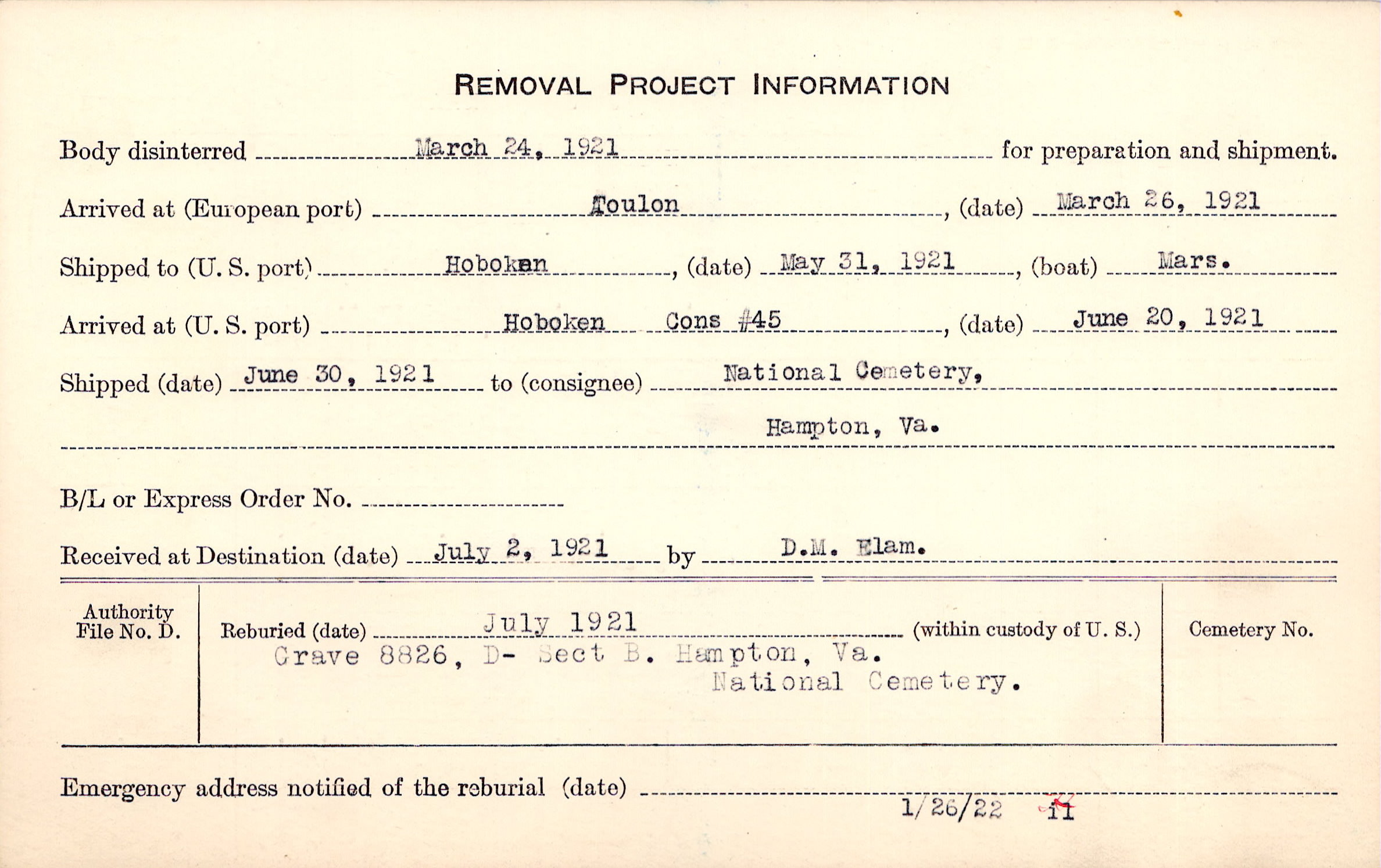 Body disinterred 3/24/1921 for preparation and shipment.