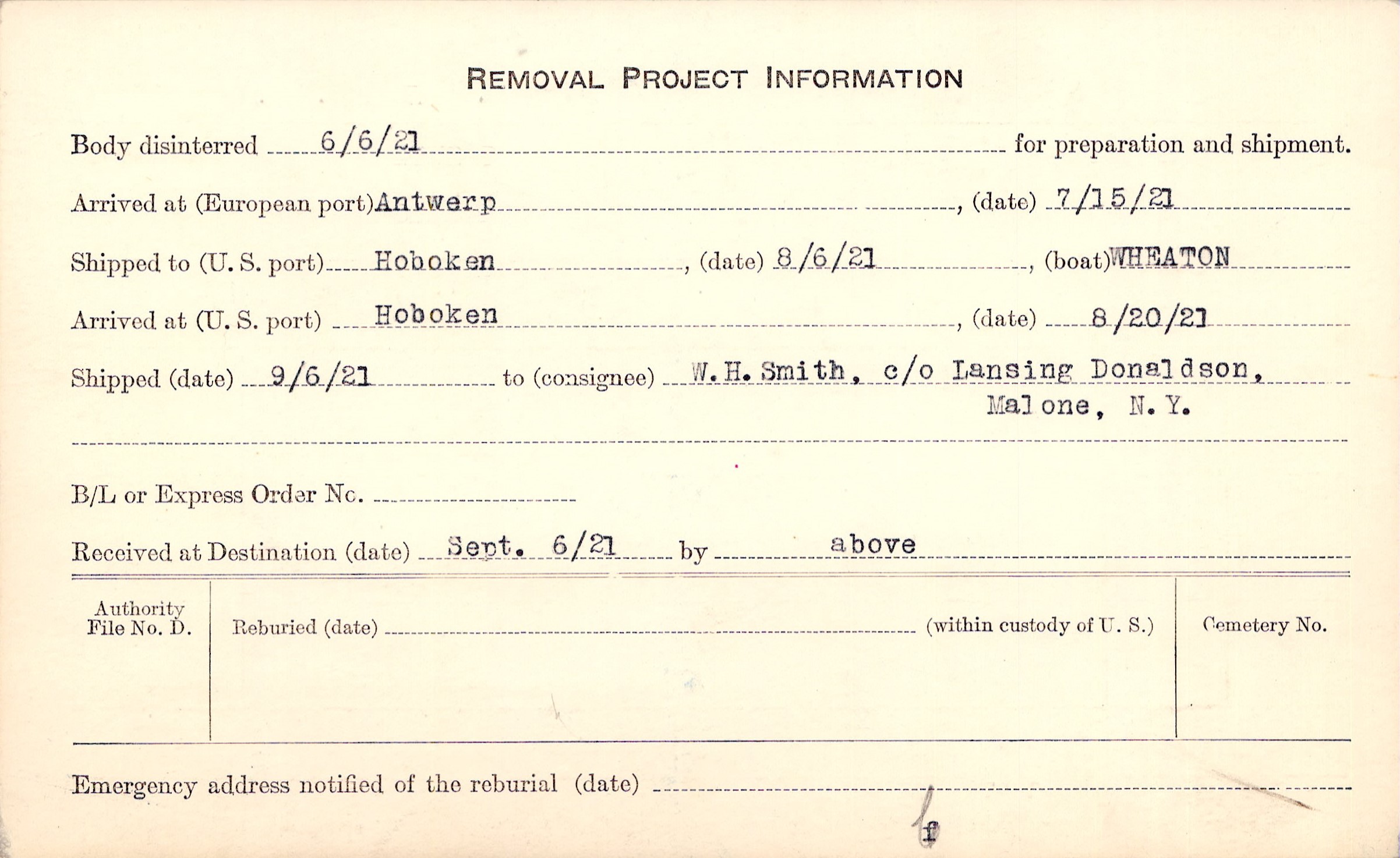 to W. H. Smith, c/o Lansing Donaldson, Malone, N. Y.