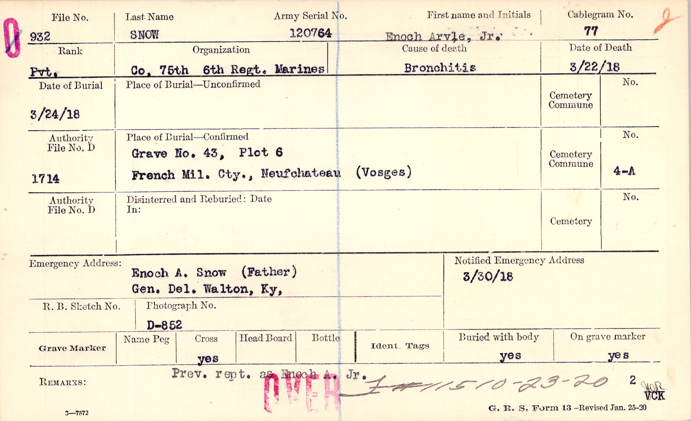 Enoch A. Snow (Father), Gen. Del. Walton, Ky.