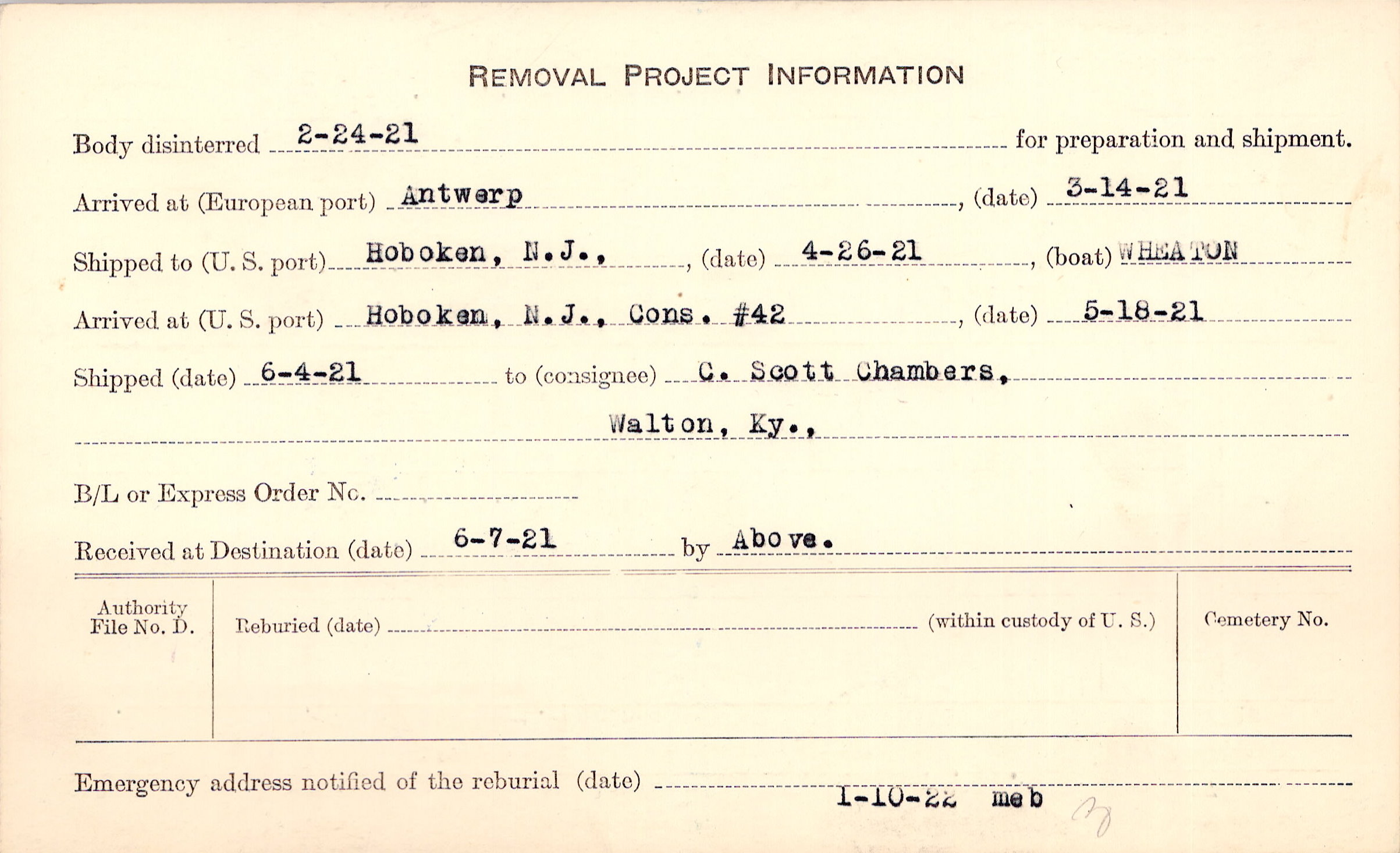 Body disinterred 2/24/1921 for preparation and shipment.