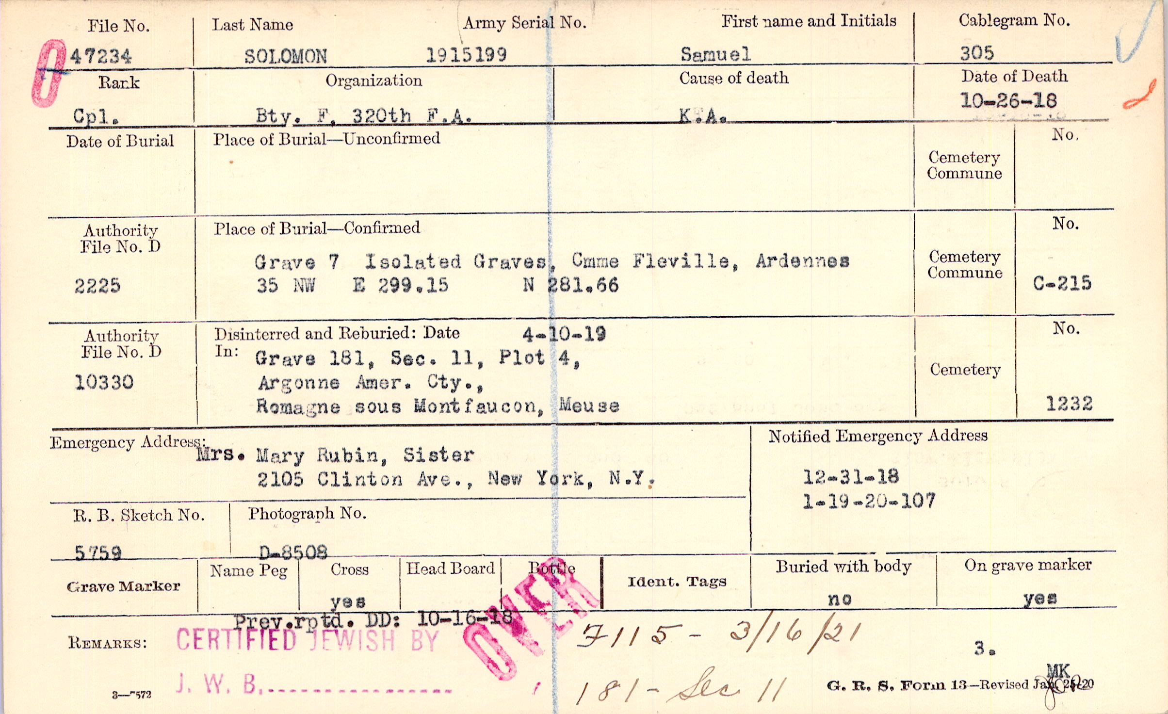 Grave 181, Section 11, Plot 4, Argonne American Cemetery, Romagne-sous-Montfaucon, Meuse