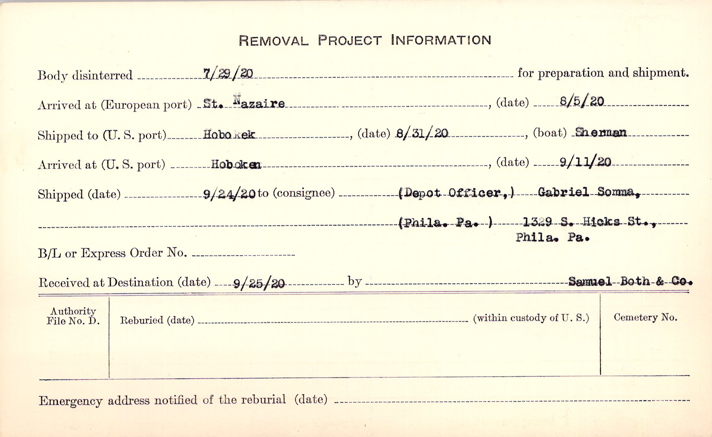 to (Depot Officer,) Gabriel Somma, (Phila. Pa.) 1329 S. Hicks St., Phila., Pa.