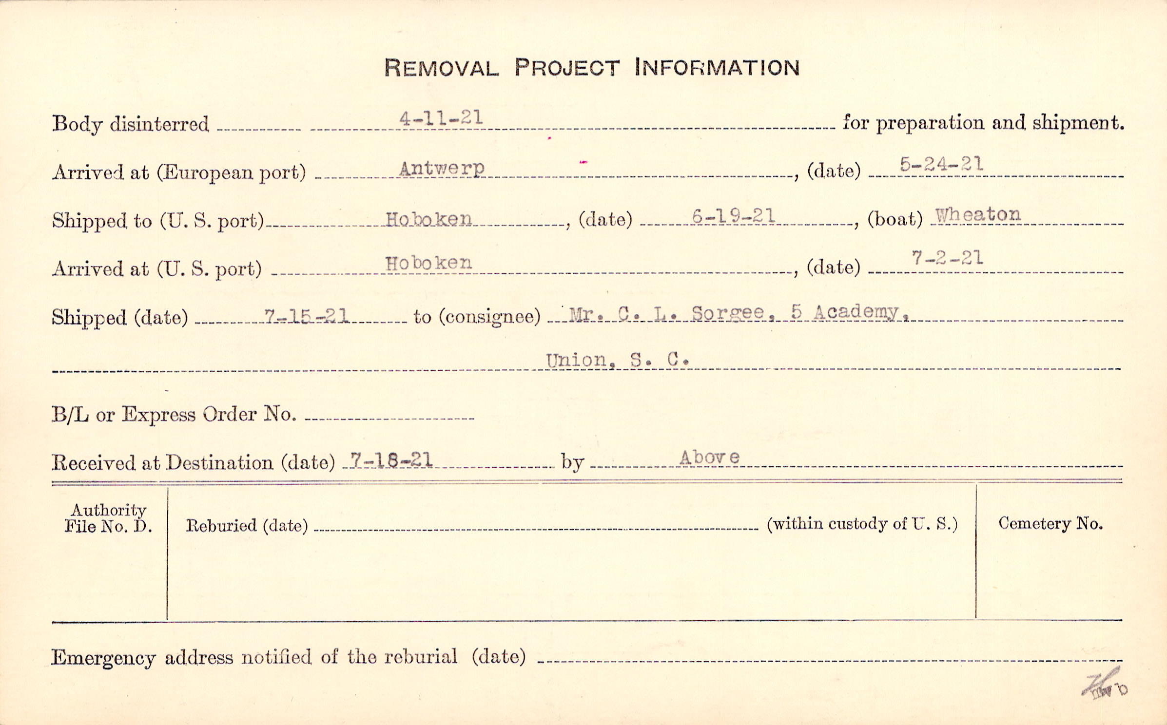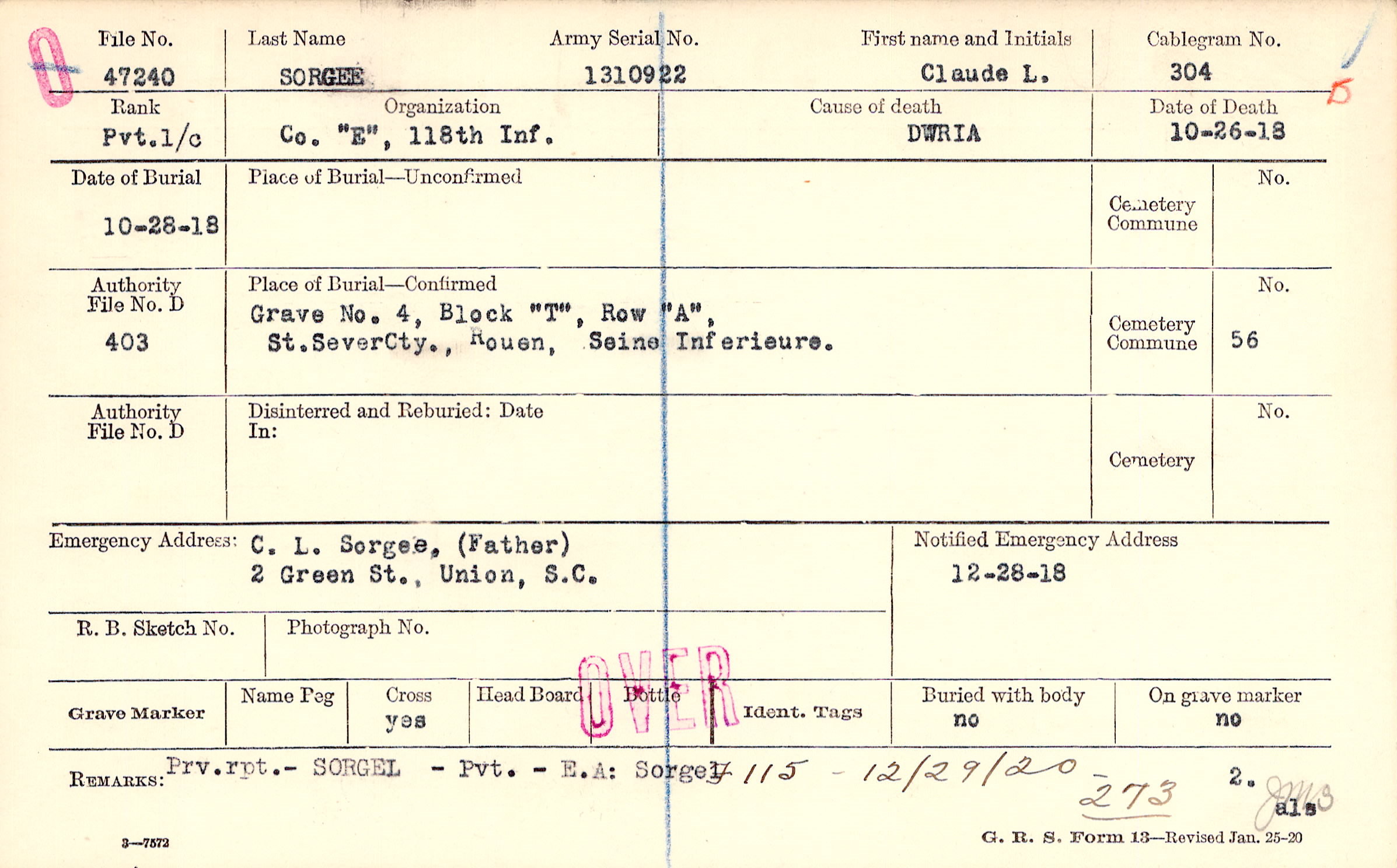 C. L. Sorgee, (Father), 2 Green St., Union, S.C.