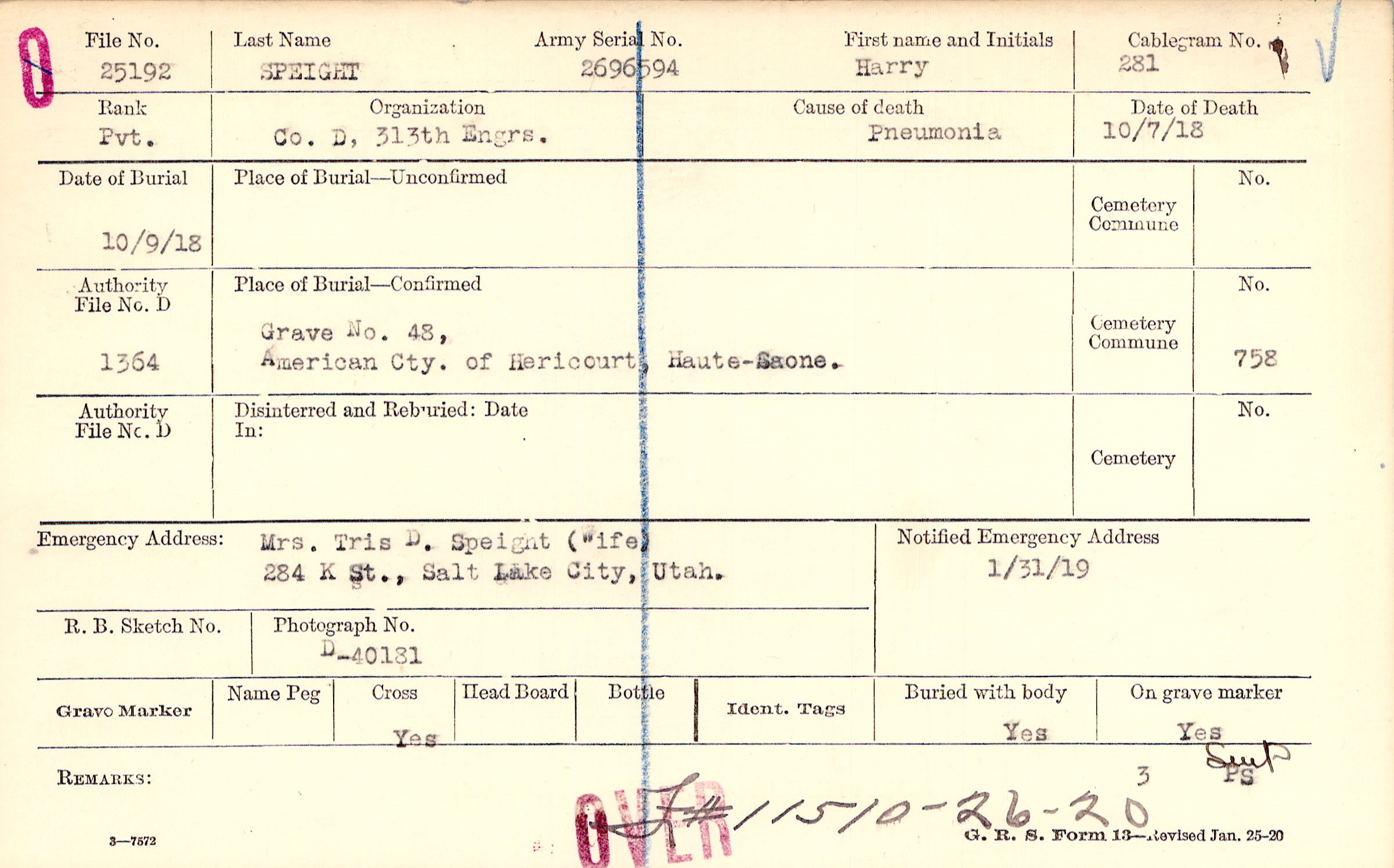 Mrs. Tris D. Speight (Wife), 284 K St., Salt Lake City, Utah.