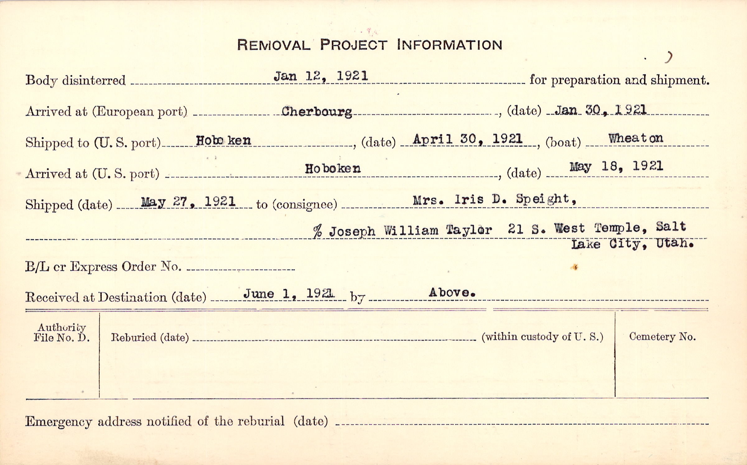 to Mrs. Iris D. Speight, % Joseph William Taylor 21 S. West Temple, Salt Lake City, Utah.