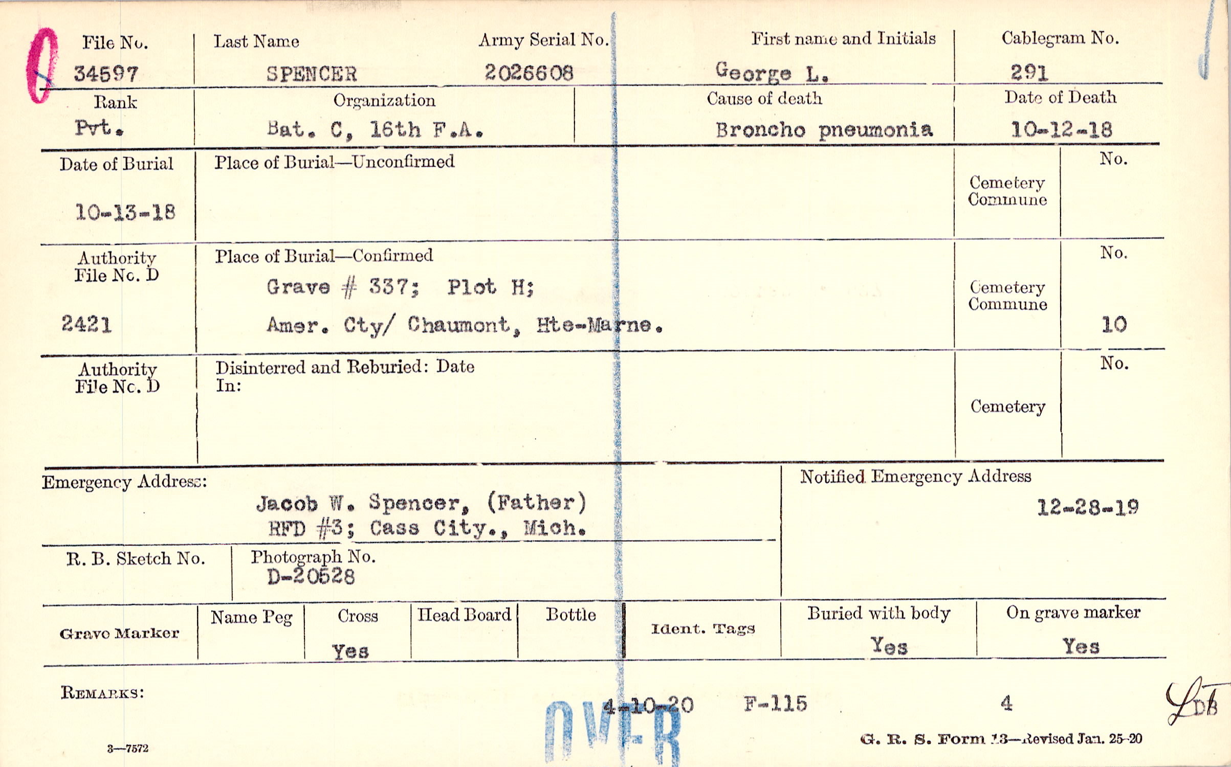 Grave #337, Plot H, Amer. Cty., Chaumont, Hte-Marne.