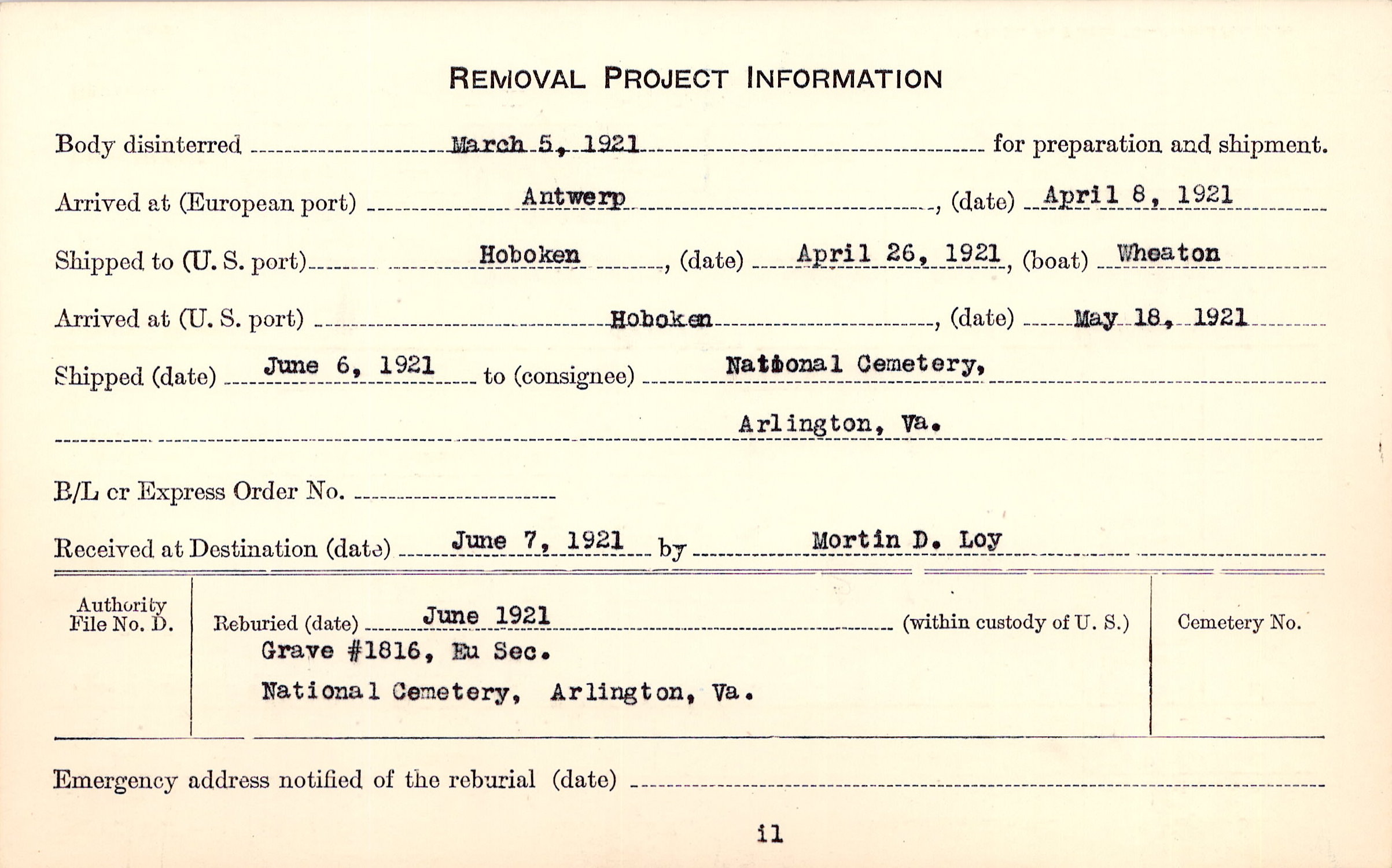Body disinterred 3/5/1921 for preparation and shipment.