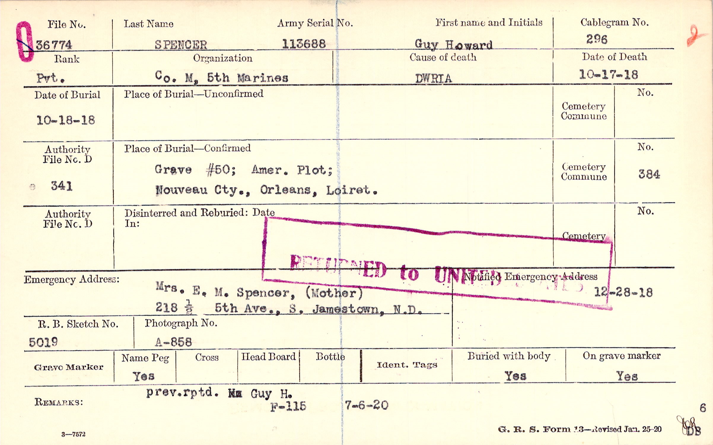 Mrs. E. M. Spencer, (Mother), 218 1/2 5th Ave., S. Jamestown, N.D.