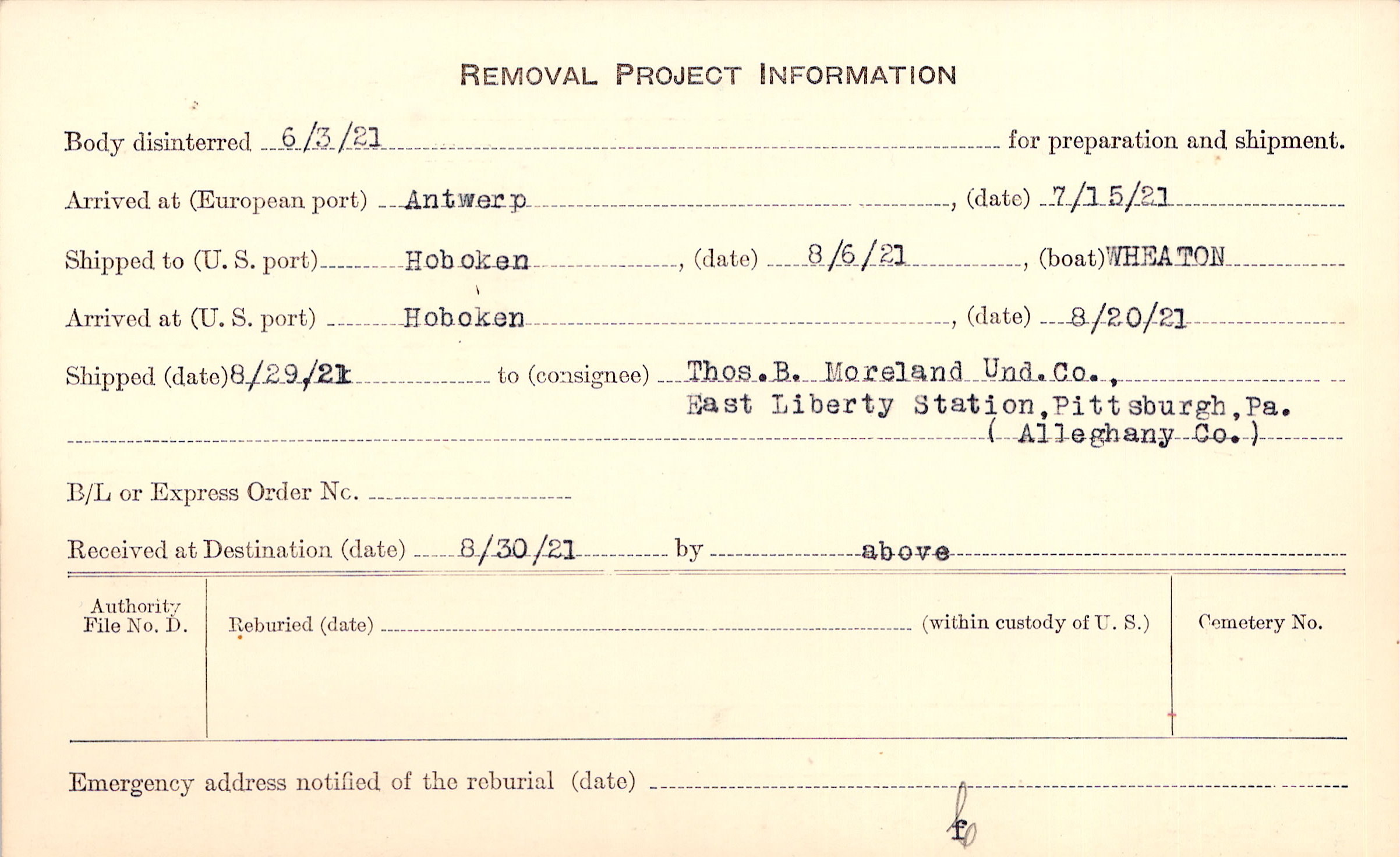 Body disinterred 6/3/1921 for preparation and shipment.