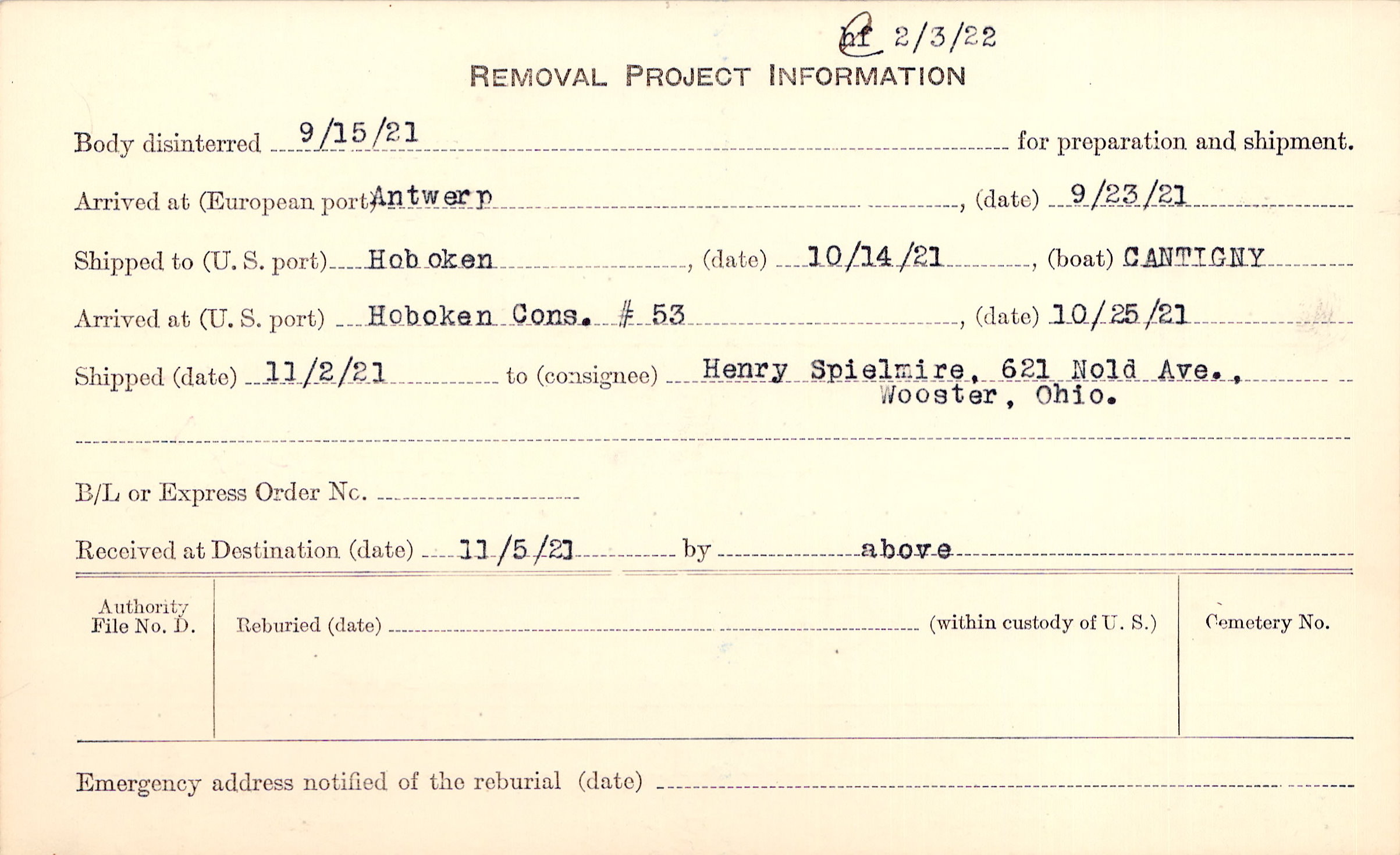 Body disinterred 9/15/1921 for preparation and shipment.