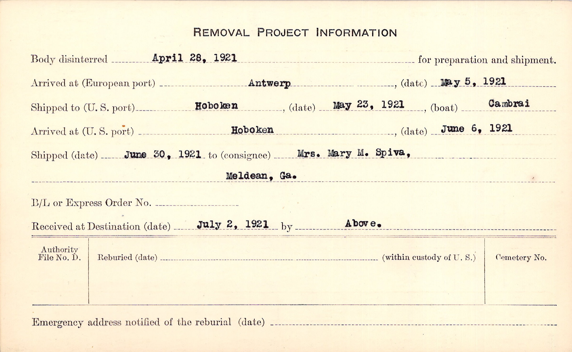 Body disinterred 4/28/1921 for preparation and shipment.