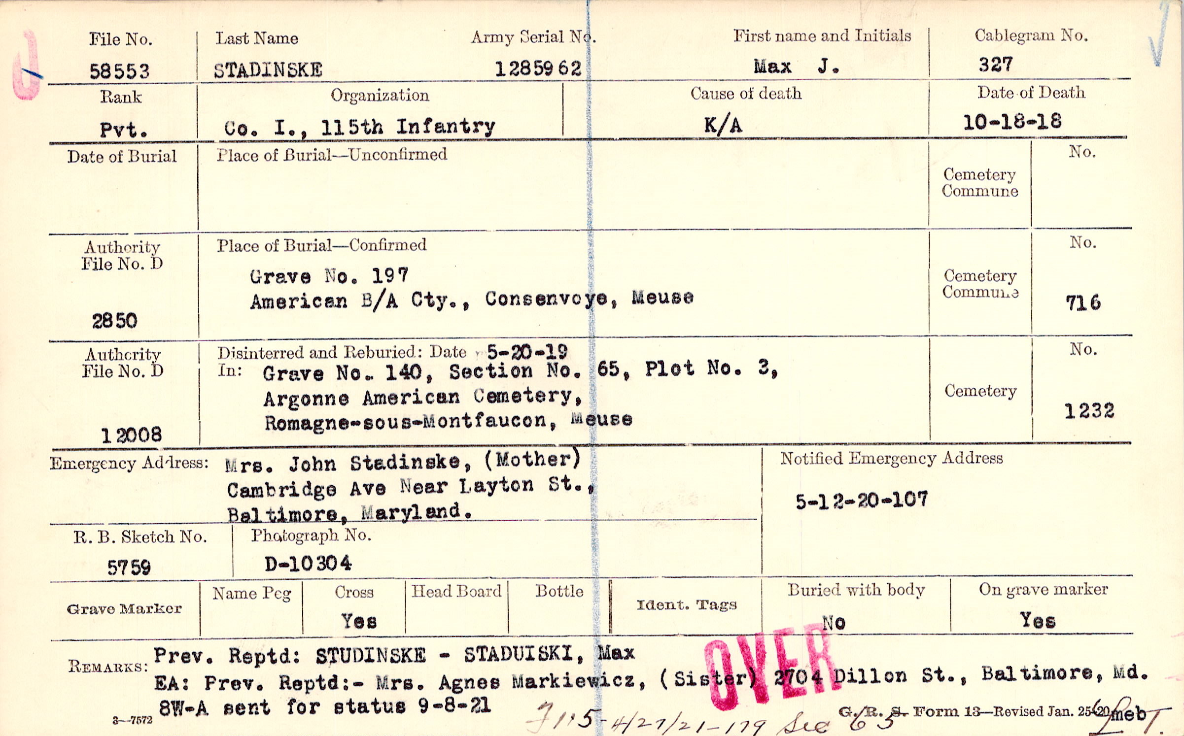 8W-A sent for status 9-8-21 Prev. Reptd: STUDINSKI - STADUISKI, Max EA: Prev. Reptd: - Mrs. Agnes Markiewicz, (Sister) 2704 Dillon St., Baltimore, Md., F115 4/27/21 - 179 Sec 65