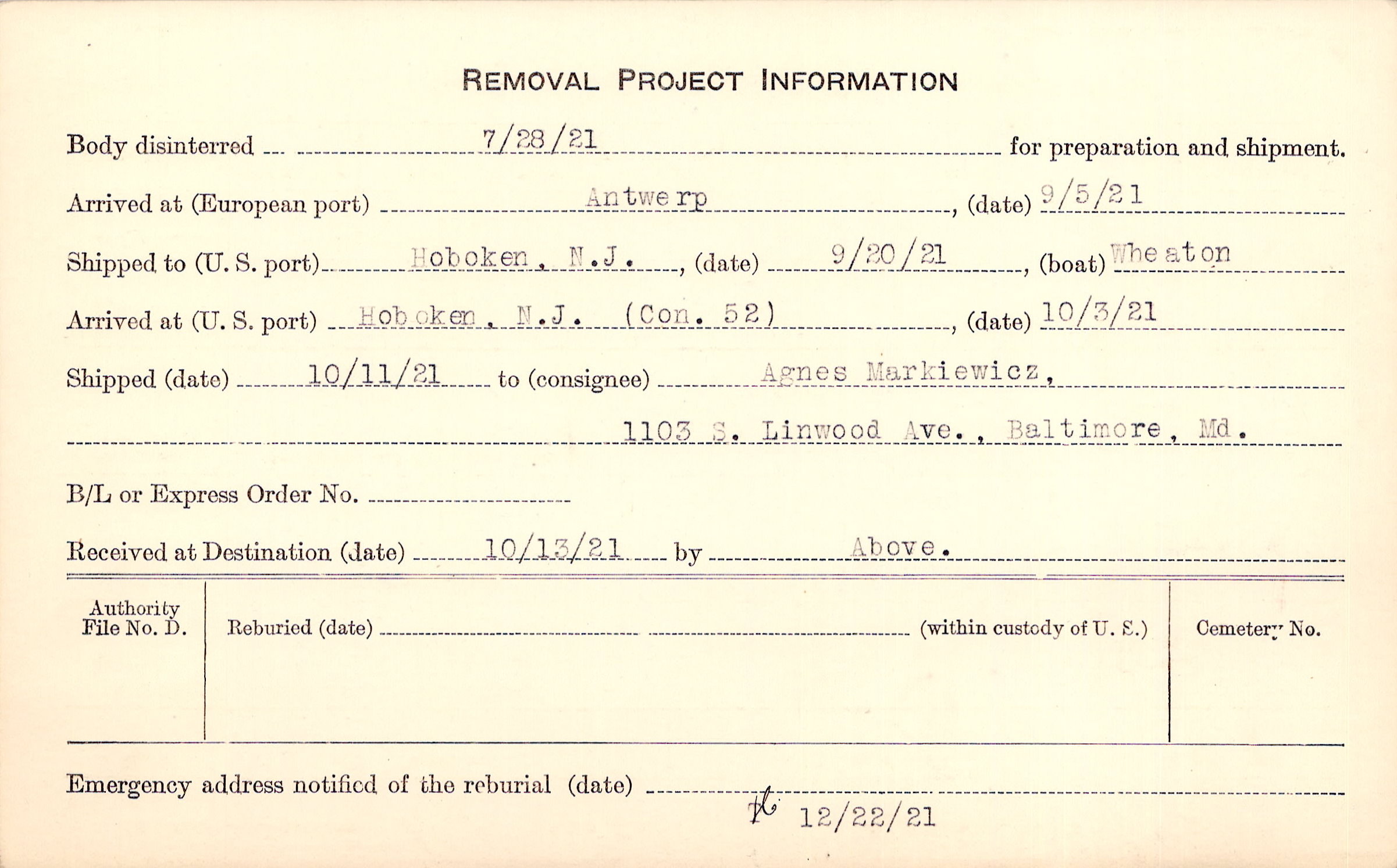 Body disinterred 7/28/1921 for preparation and shipment.