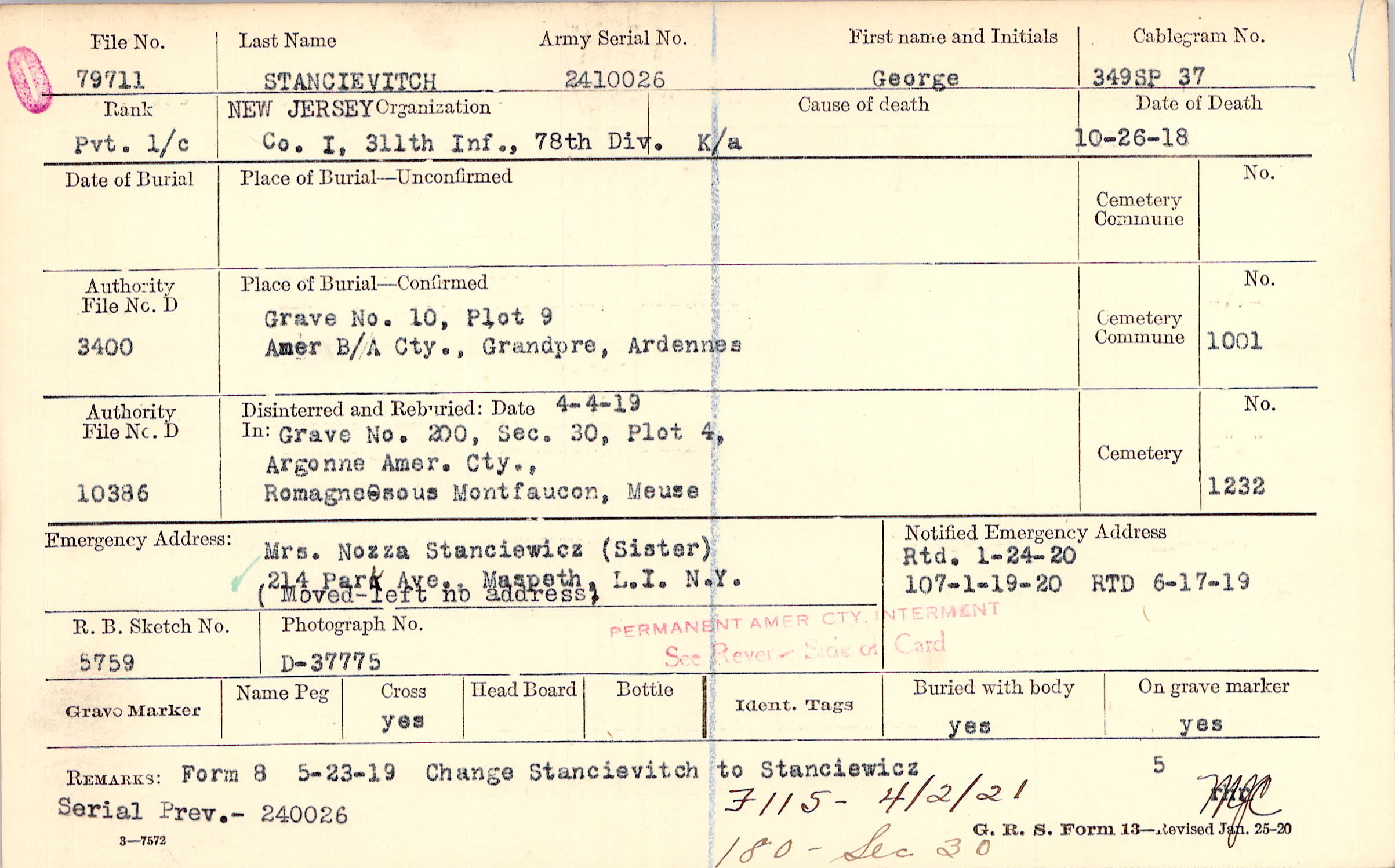 Mrs. Nozza Stanciewicz (Sister), 214 Park Ave. Maspeth, L.I. N.Y., (Moved - left no address)