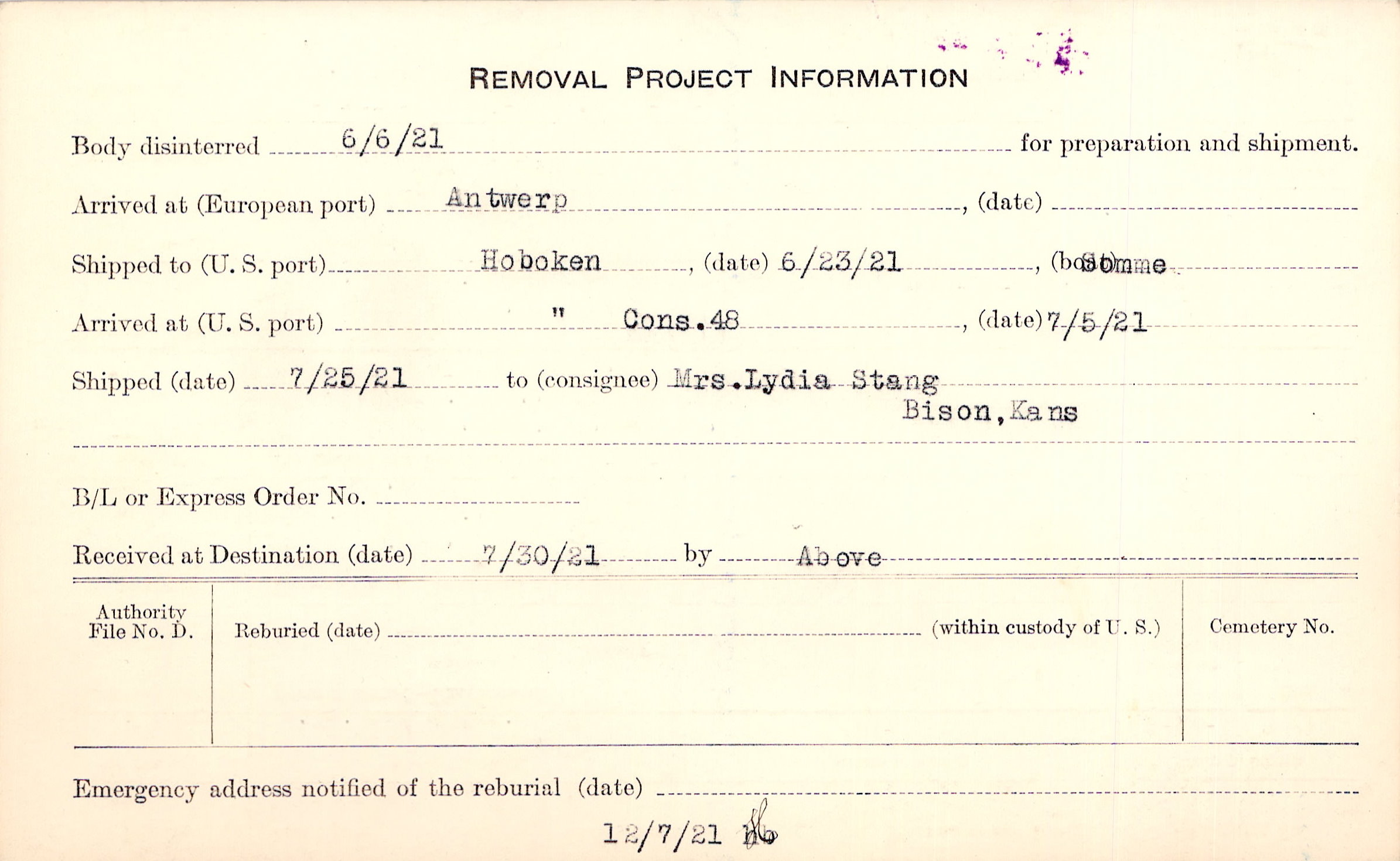 Body disinterred 6/6/1921 for preparation and shipment.