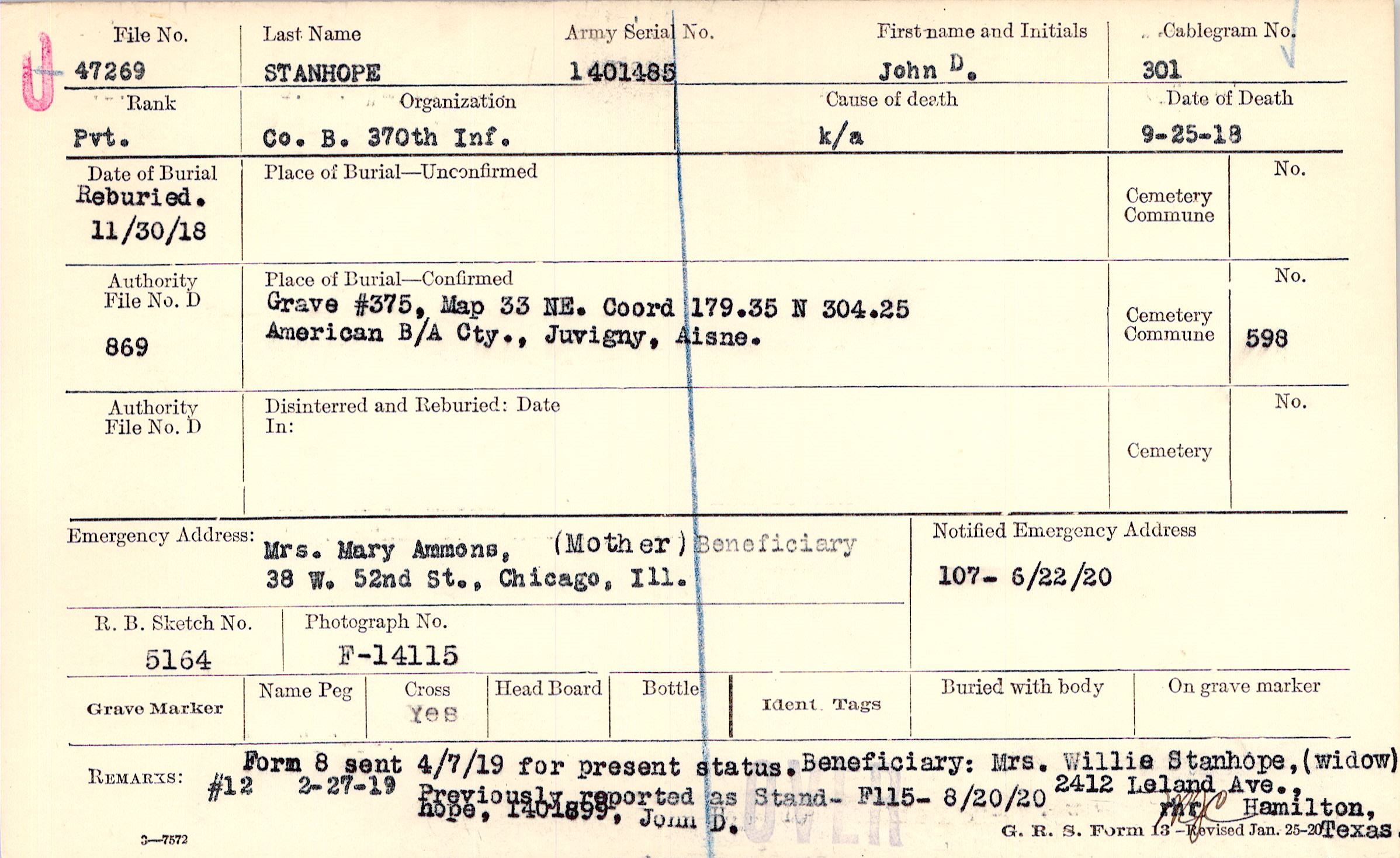 Beneficiary: Mrs. Willie Stanhope, (widow) 2412 Leland Ave., Hamilton, Texas Previously reported as Standhope, 1401899, John D., Form 8 sent 4/7/19 for present status., #12 2-27-19, F115- 8/20/20