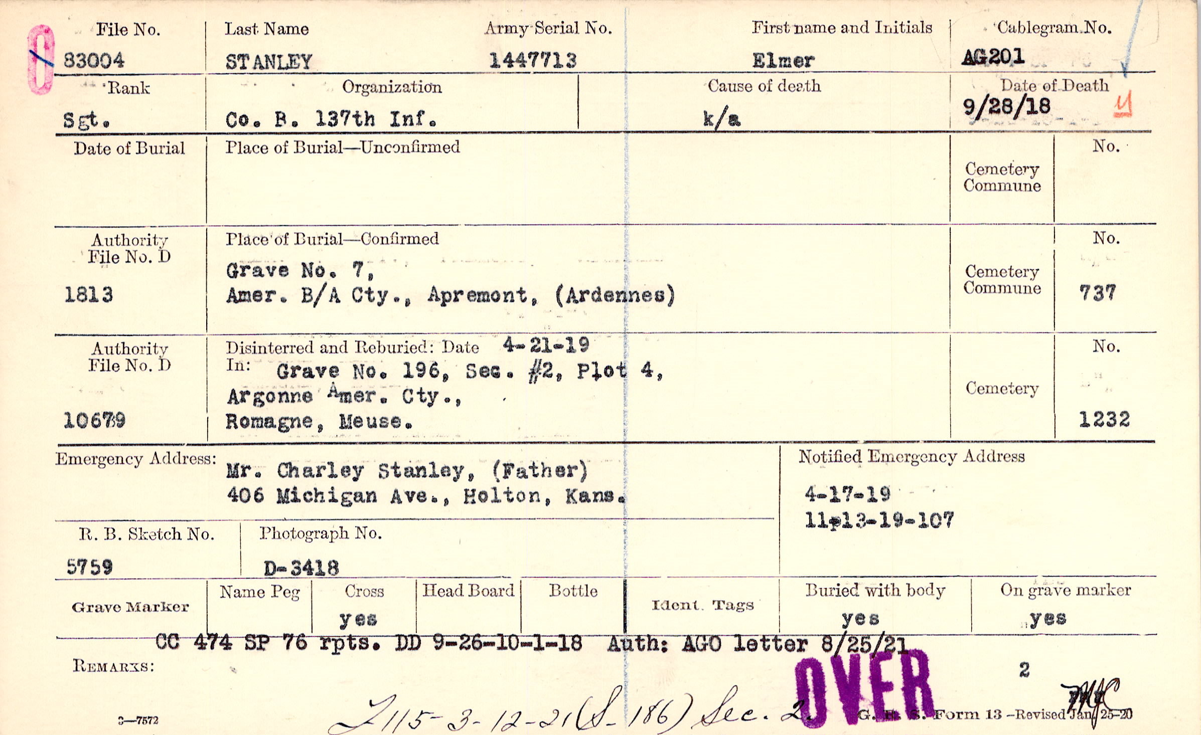 Mr. Charley Stanley, (Father), 406 Michigan Ave., Holton, Kans.