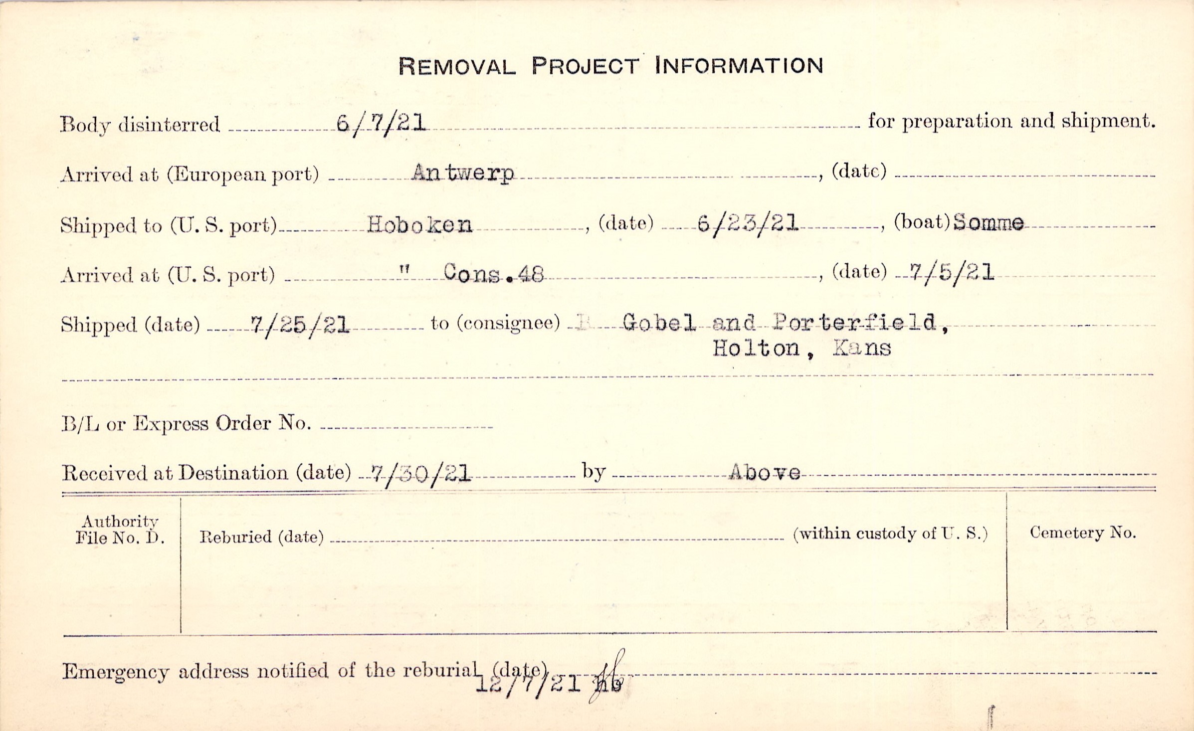Body disinterred 6/7/1921 for preparation and shipment.