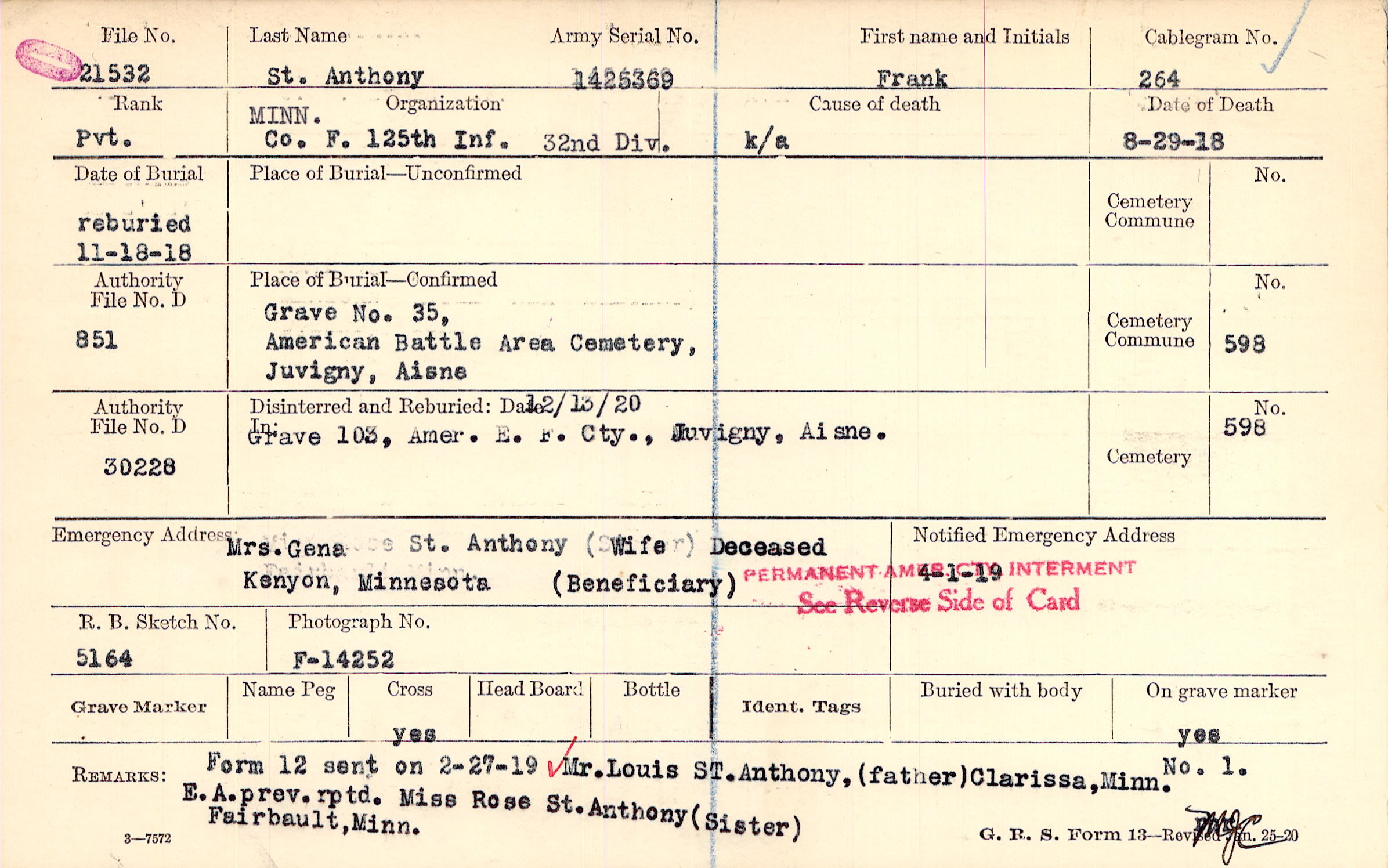 Mrs. Gena St. Anthony (Wife) (Beneficiary) Deceased, Kenyon, Minnesota, Deceased (Beneficiary)