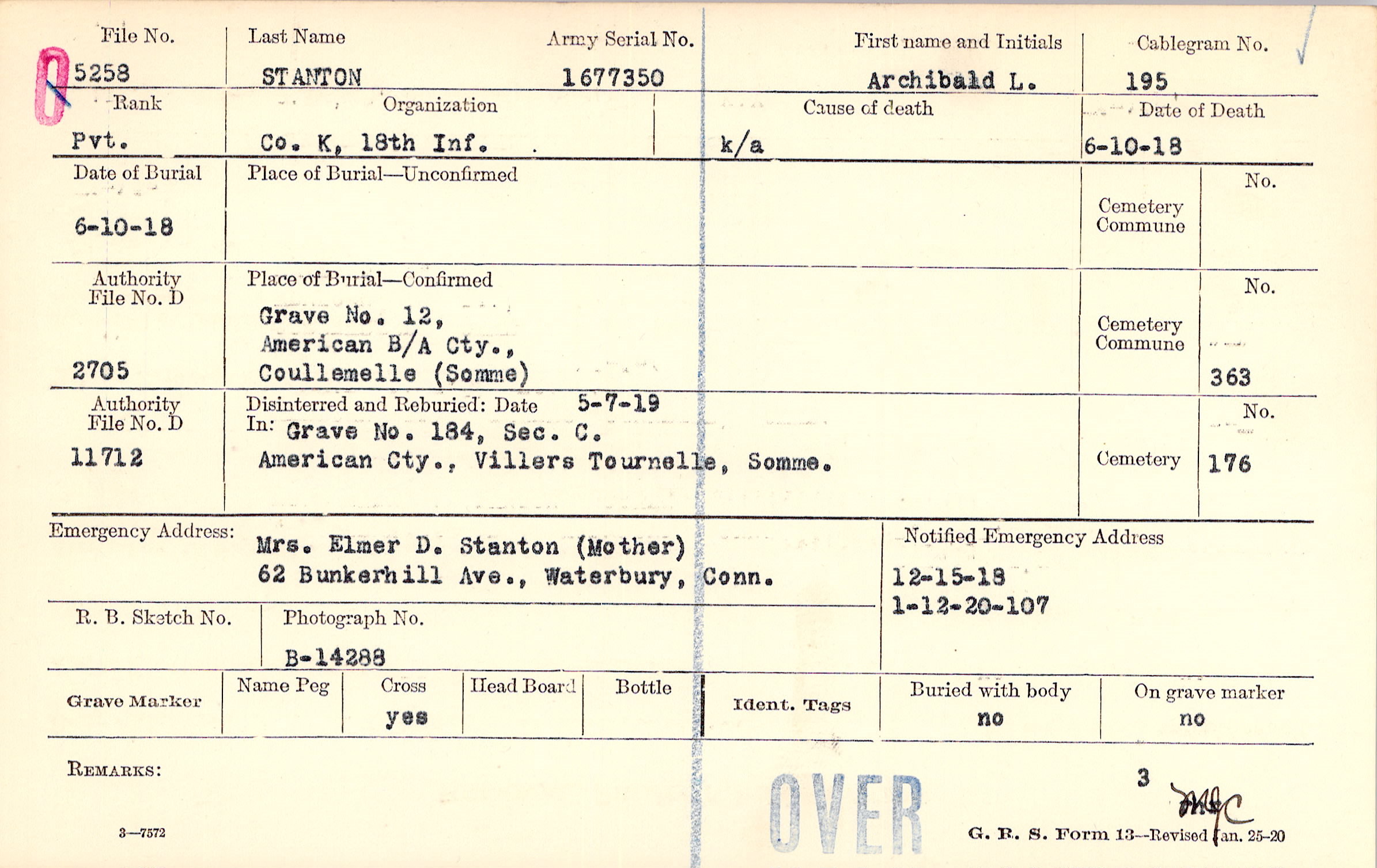 Mrs. Elmer D. Stanton (Mother), 62 Bunkerhill Ave., Waterbury, Conn.
