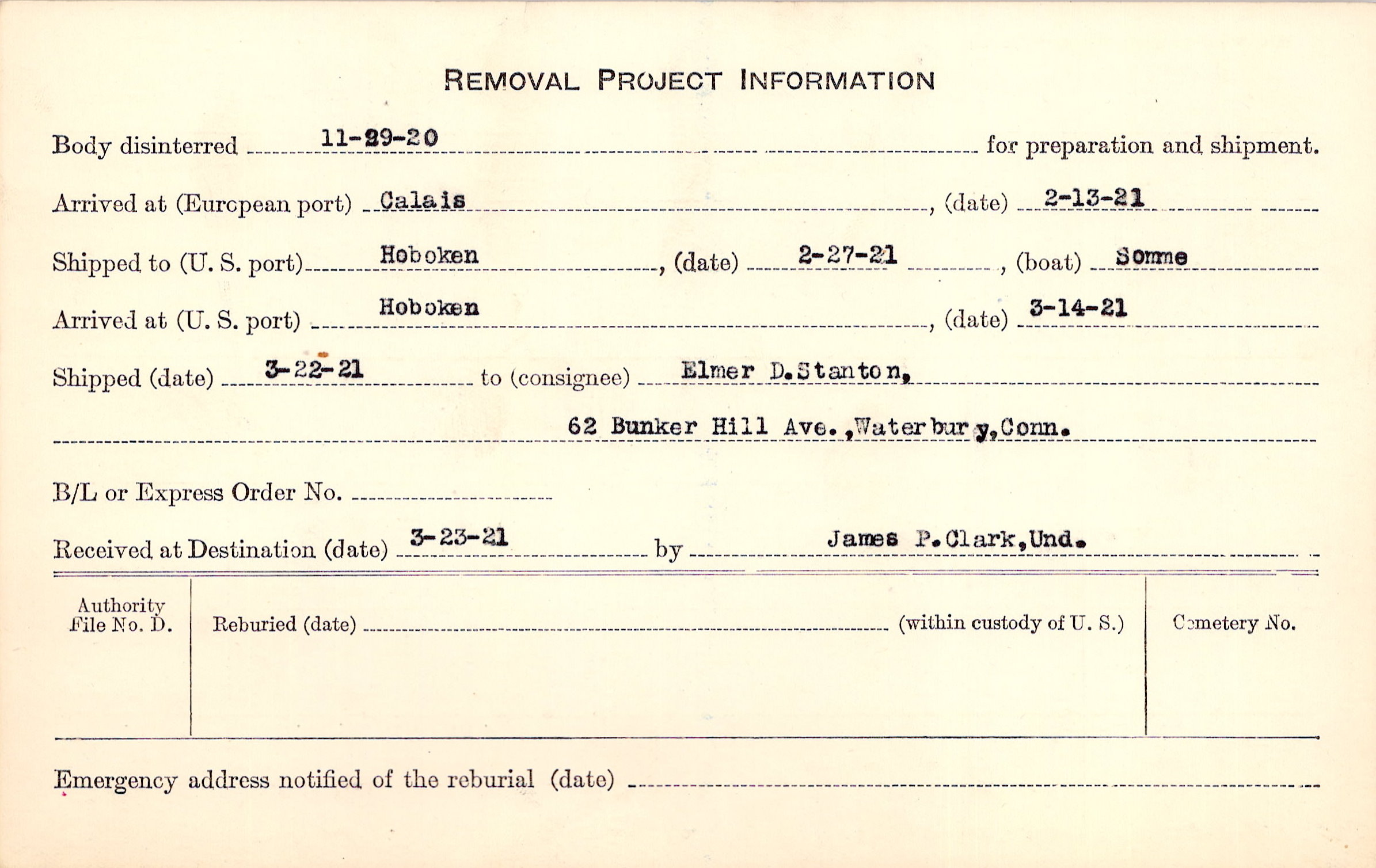 Body disinterred 11/29/1920 for preparation and shipment.