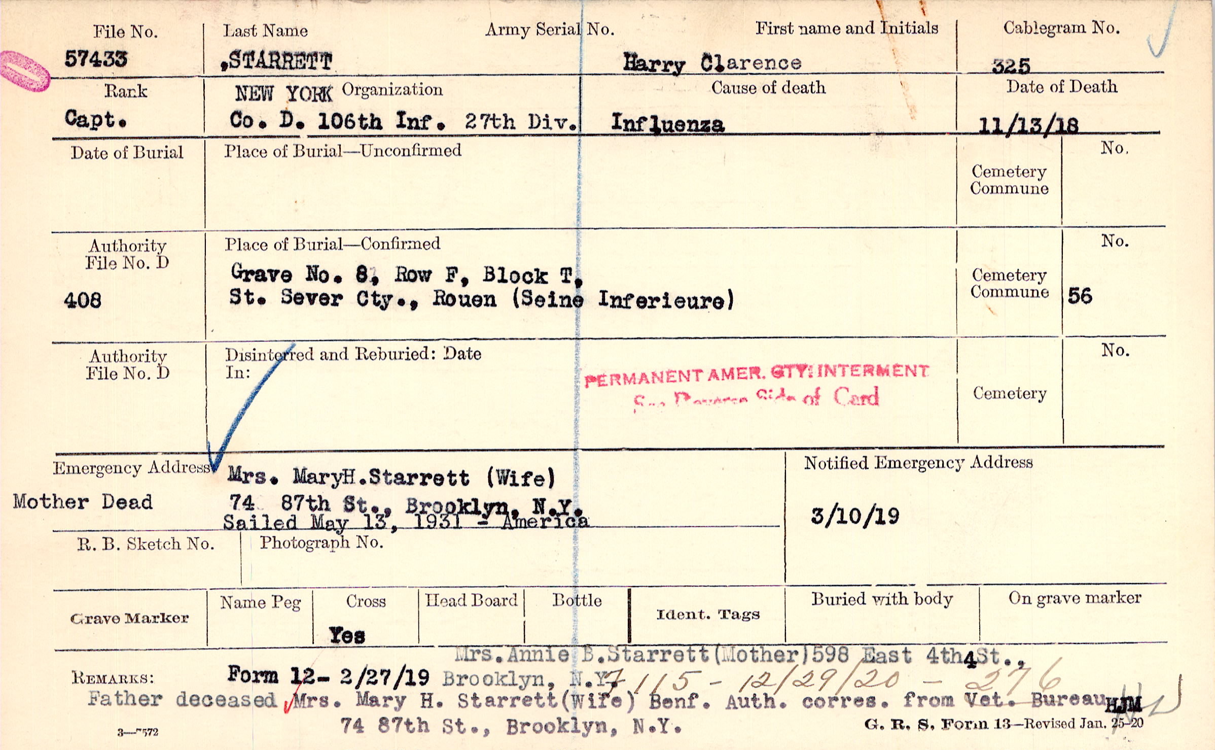 Mrs. Mary H. Starrett (Wife), 74 87th St., Brooklyn, N.Y., Mother Dead Sailed May 13, 1931 - America