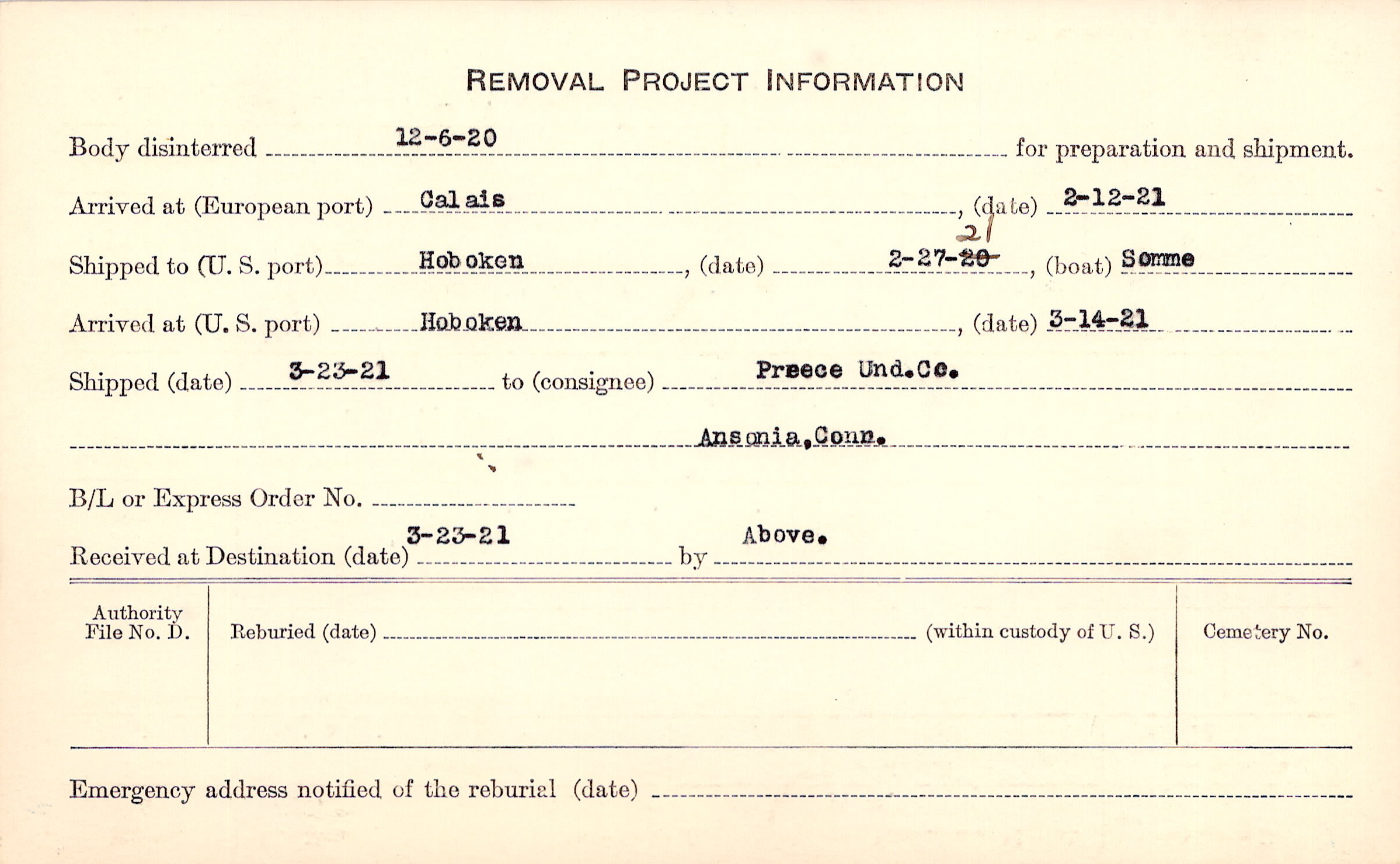 Body disinterred 12/6/1920 for preparation and shipment.