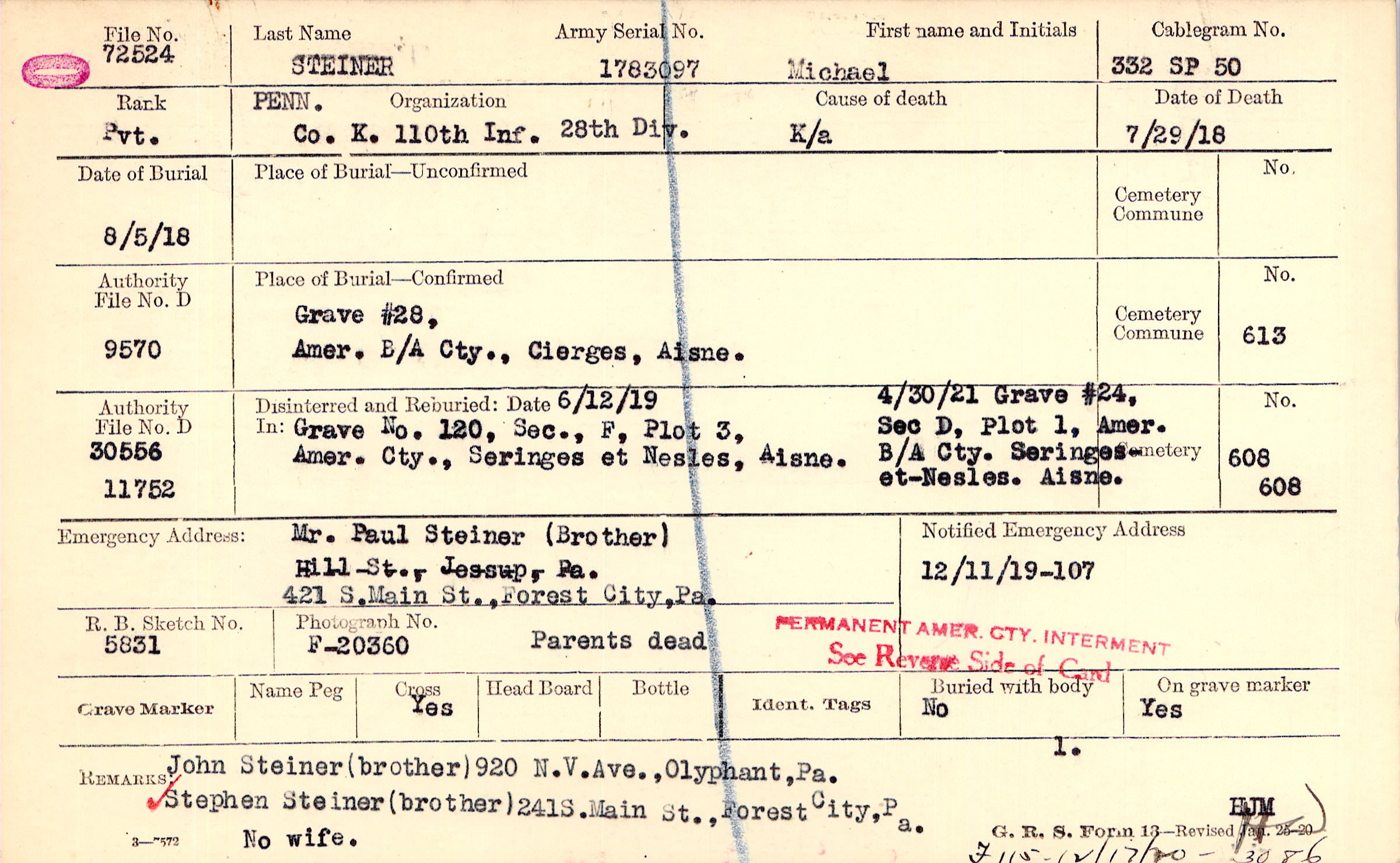 John Steiner (brother) 920 N.V. Ave., Olyphant, Pa. Stephen Steiner (brother) 241 S. Main St., Forest City, Pa. No wife., F115 - 12/17/20- 3086