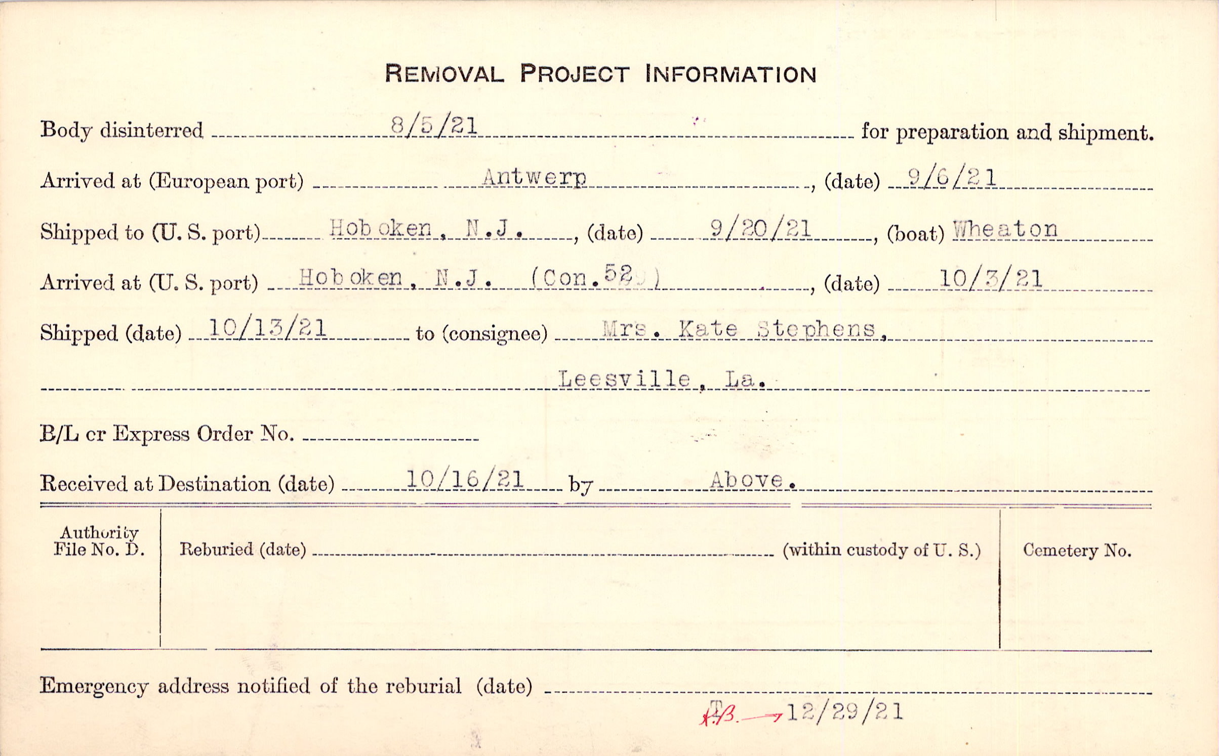 Body disinterred 8/5/1921 for preparation and shipment.