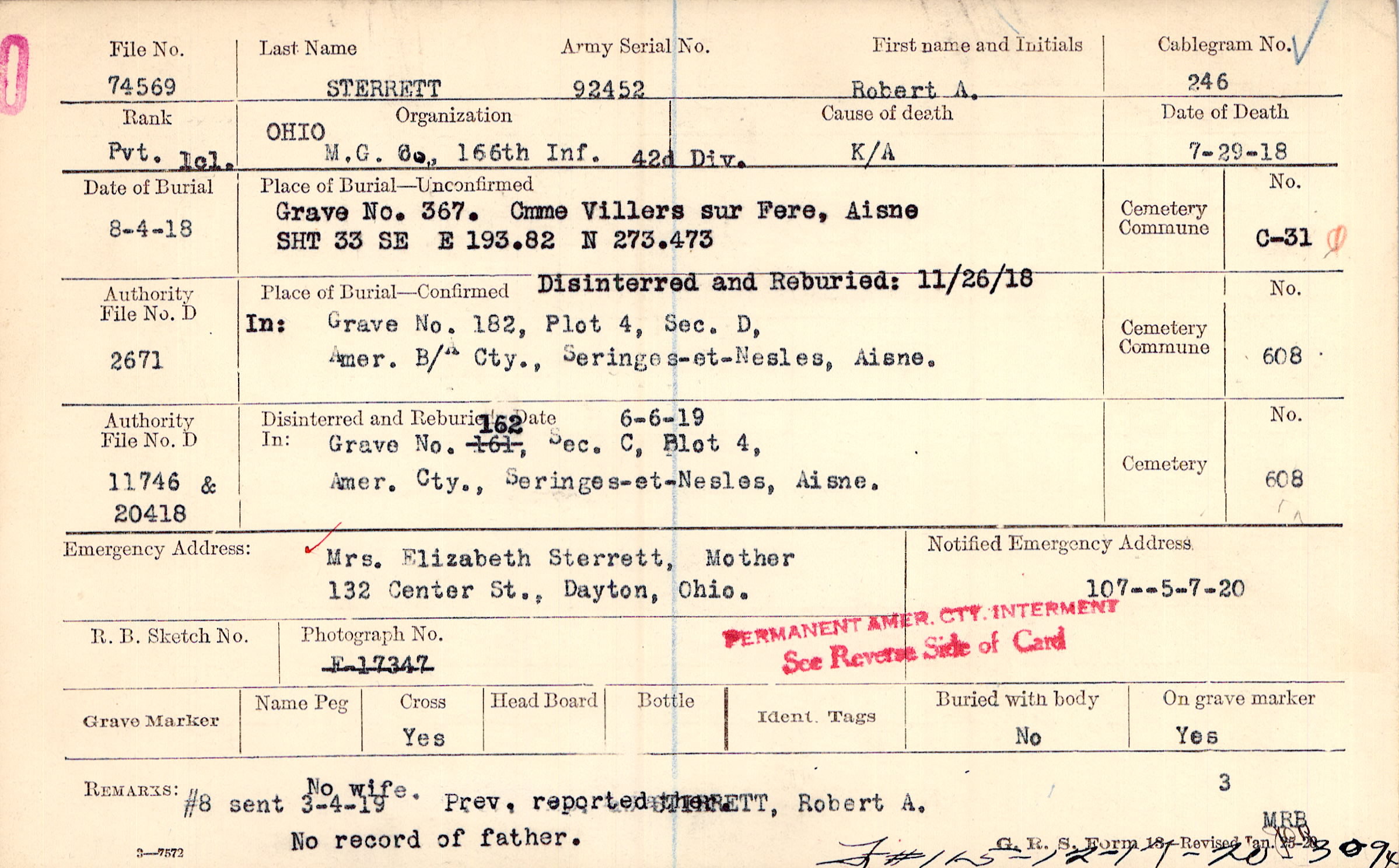 Mrs. Elizabeth Sterrett, Mother, 132 Center St., Dayton, Ohio., No wife. #8 sent 3-4-19. Prev. reported #crossedout ETT, Robert A. No record of father.