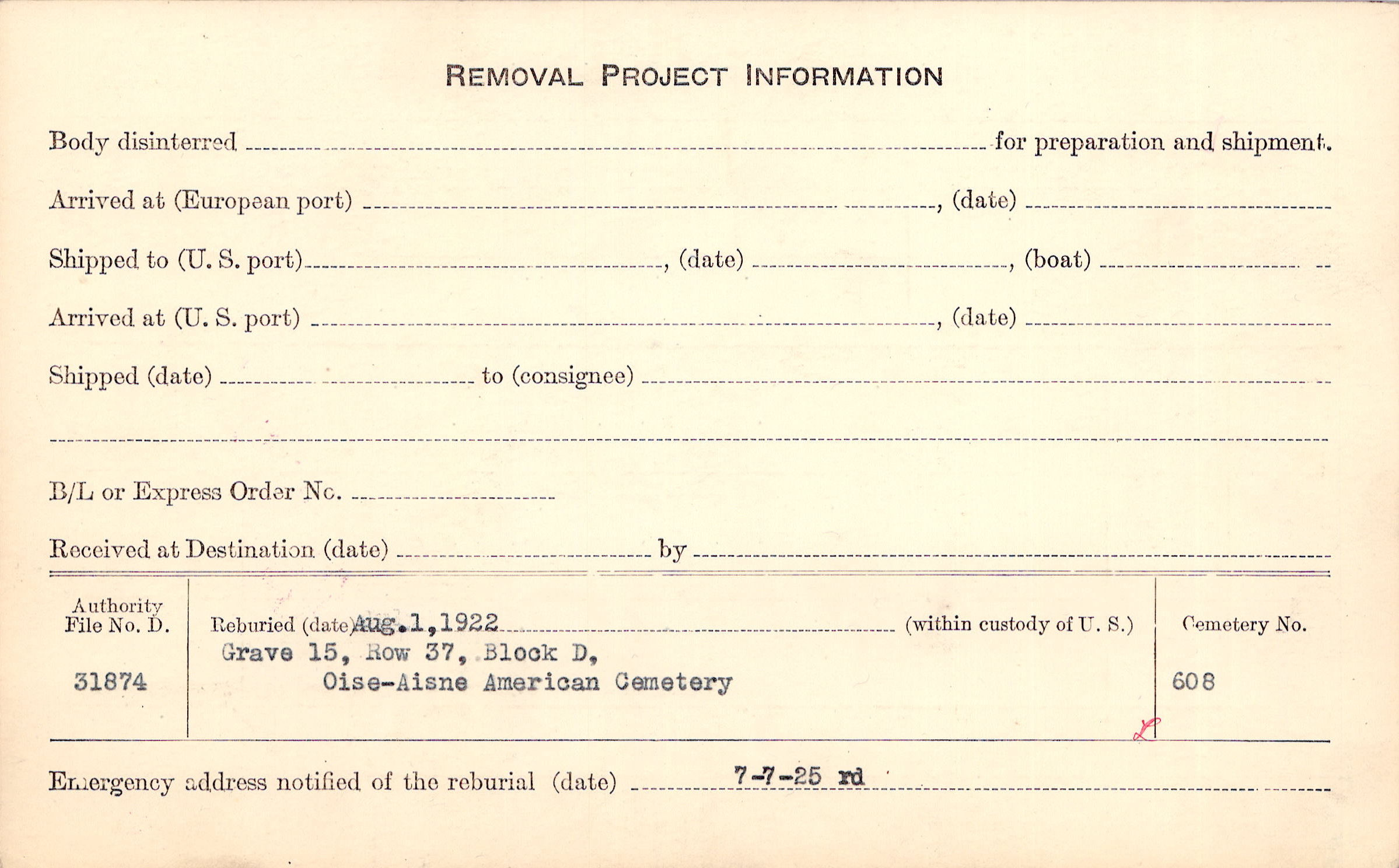 #Disinterred and Reburied: 11/26/18 In: Grave 182, Plot 4, Sec. D, Amer. B/A Cty., Seringes-et-Nesles, Aisne