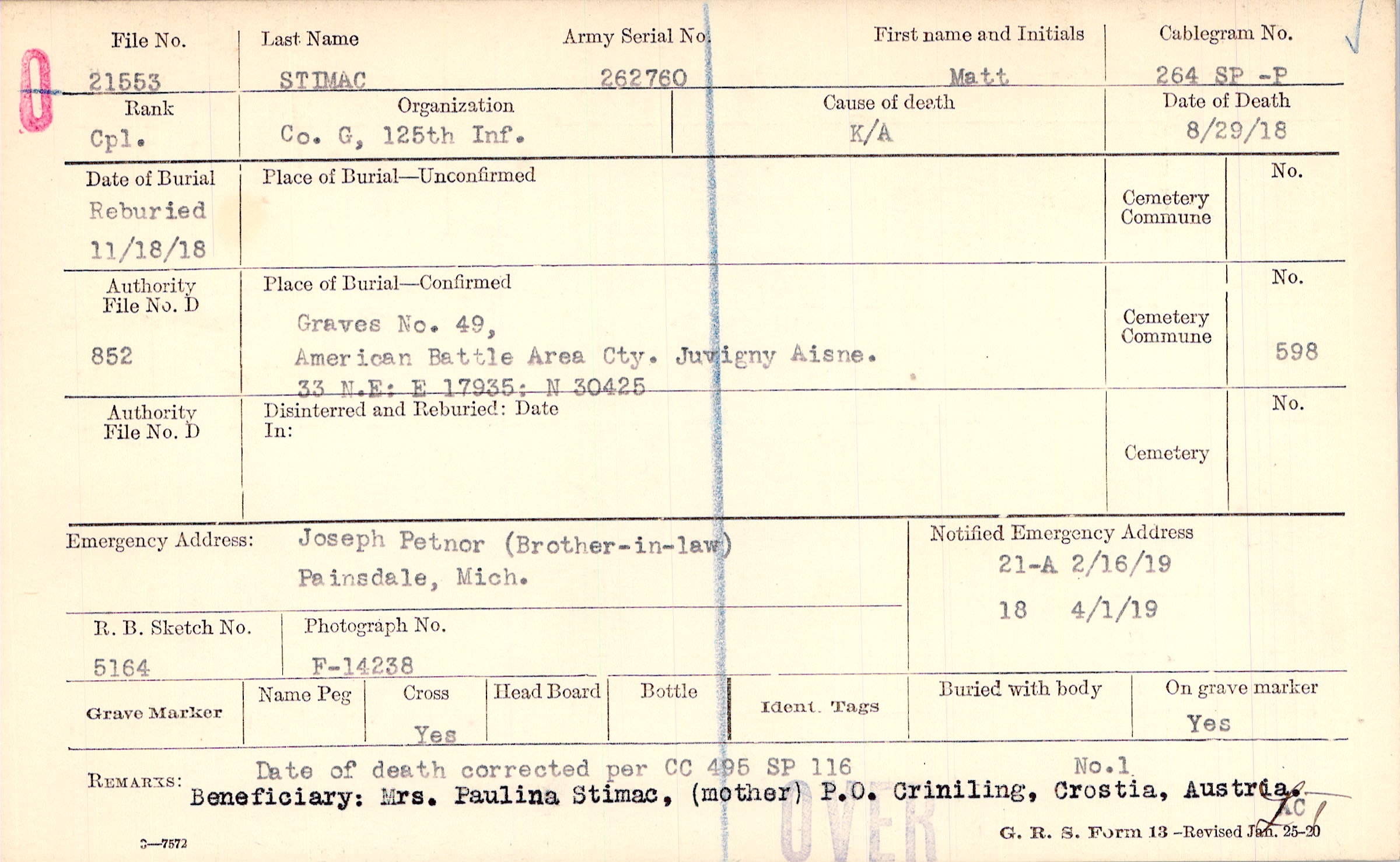 Date of death corrected per CC 495 SP 116 Beneficiary: Mrs. Paulina Stimac, (mother) P.O. Criniling, Crostia, Austria.