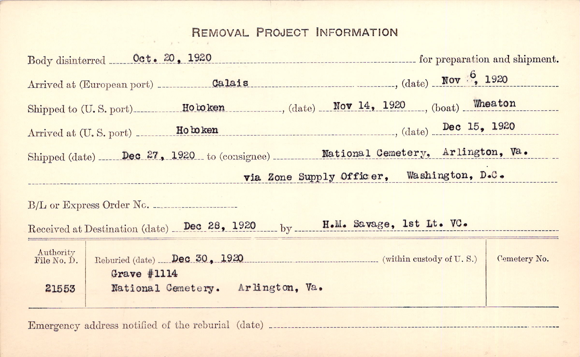Body disinterred 10/20/1920 for preparation and shipment.