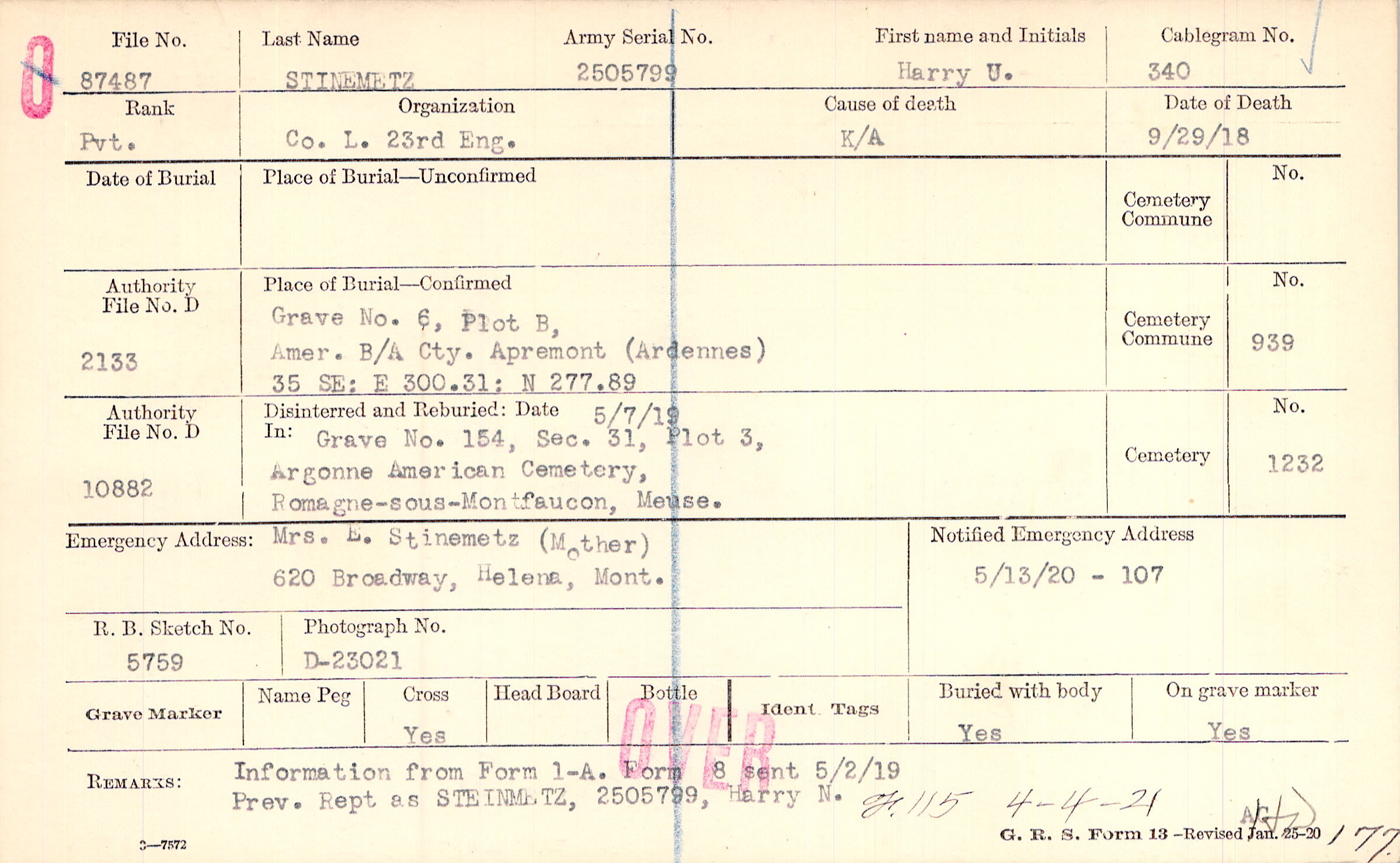 Mrs. E. Stinemetz (Mother), 620 Broadway, Helena, Mont.