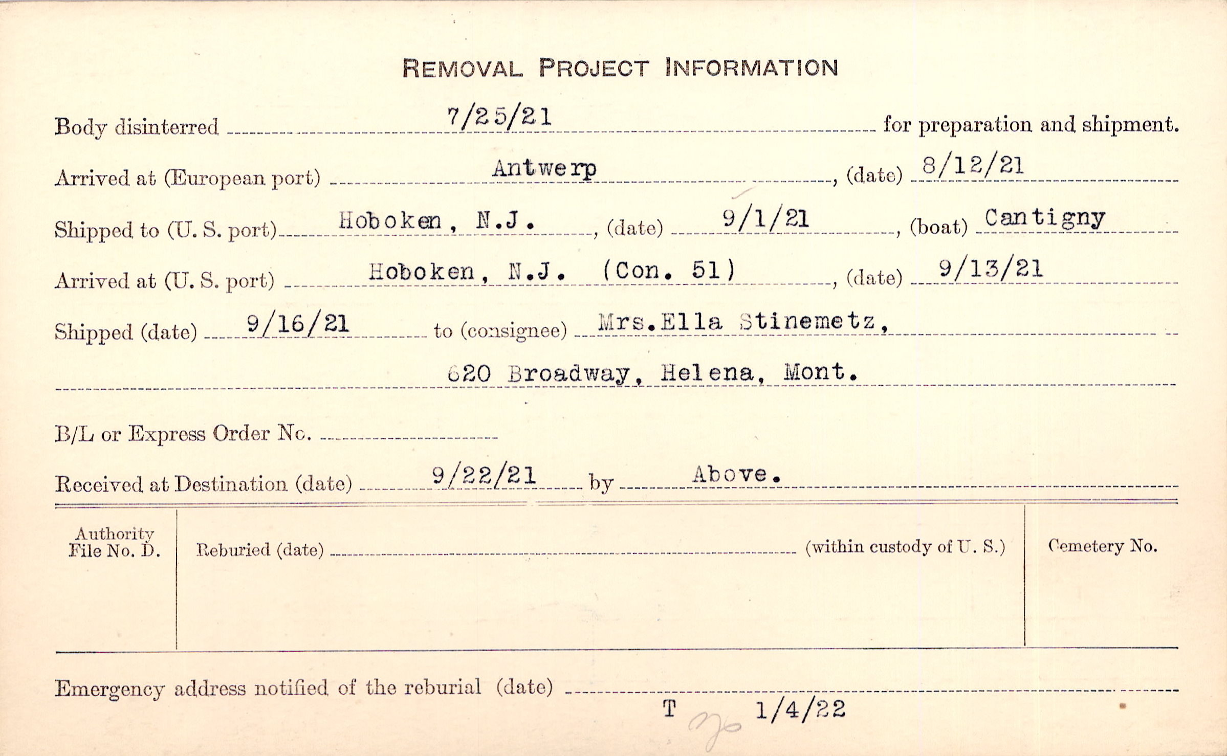 Body disinterred 7/25/1921 for preparation and shipment.
